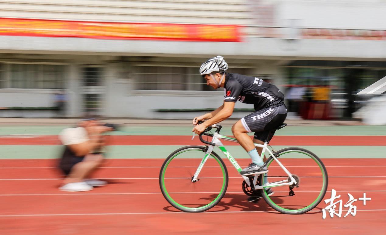 8月29日上午,自行车比赛现场,计时赛上选手急速冲过终点。