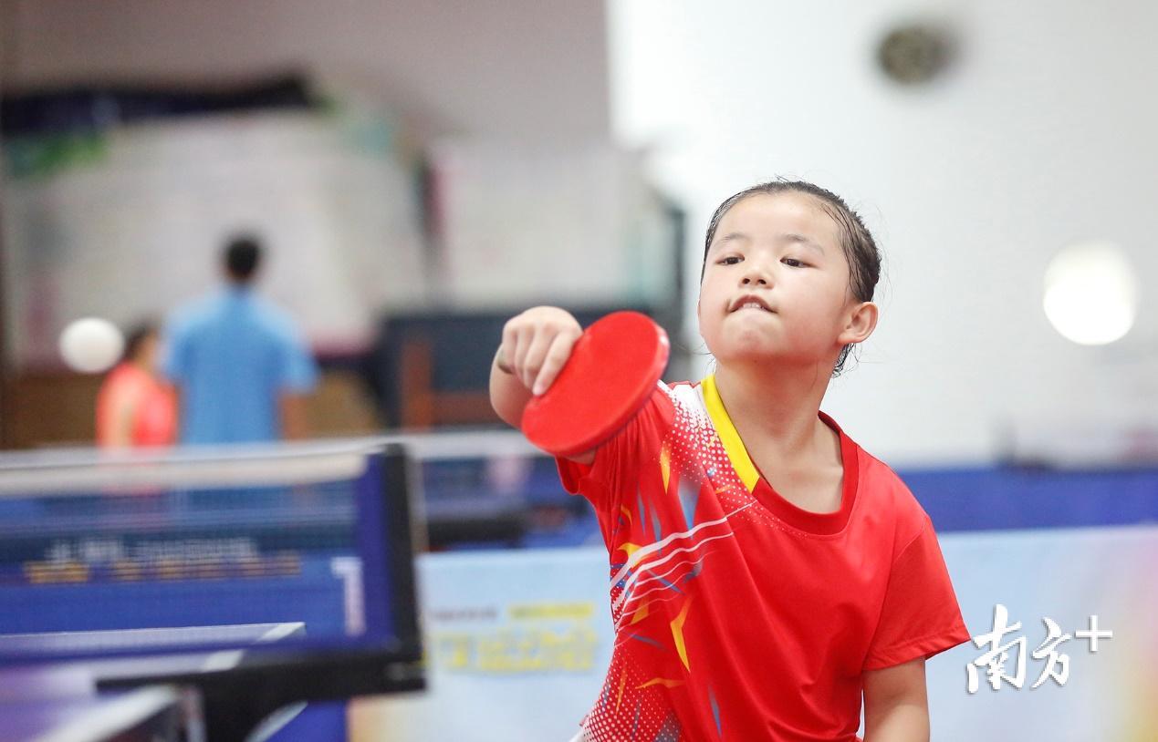 8月27日上午,乒乓球比赛现场,小选手挥拍接球。