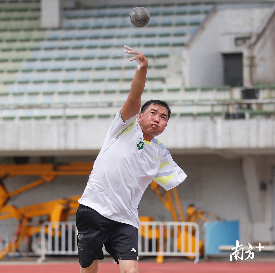 8月28日上午,田径比赛在市兴中体育场举行,选手在投掷铅球。