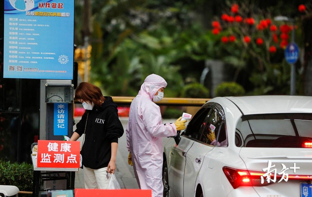 东区星光礼寓,工作人员为进入小区的住户测量体温。因为小区发现了确诊病例,测量体温的工作人员穿上了防护服。