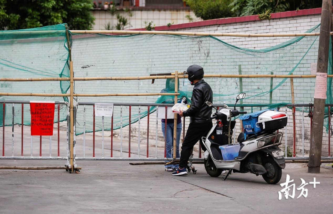 进入沙溪镇申明亭村的一条道路被封闭,“外卖小哥”只能在村外等候。