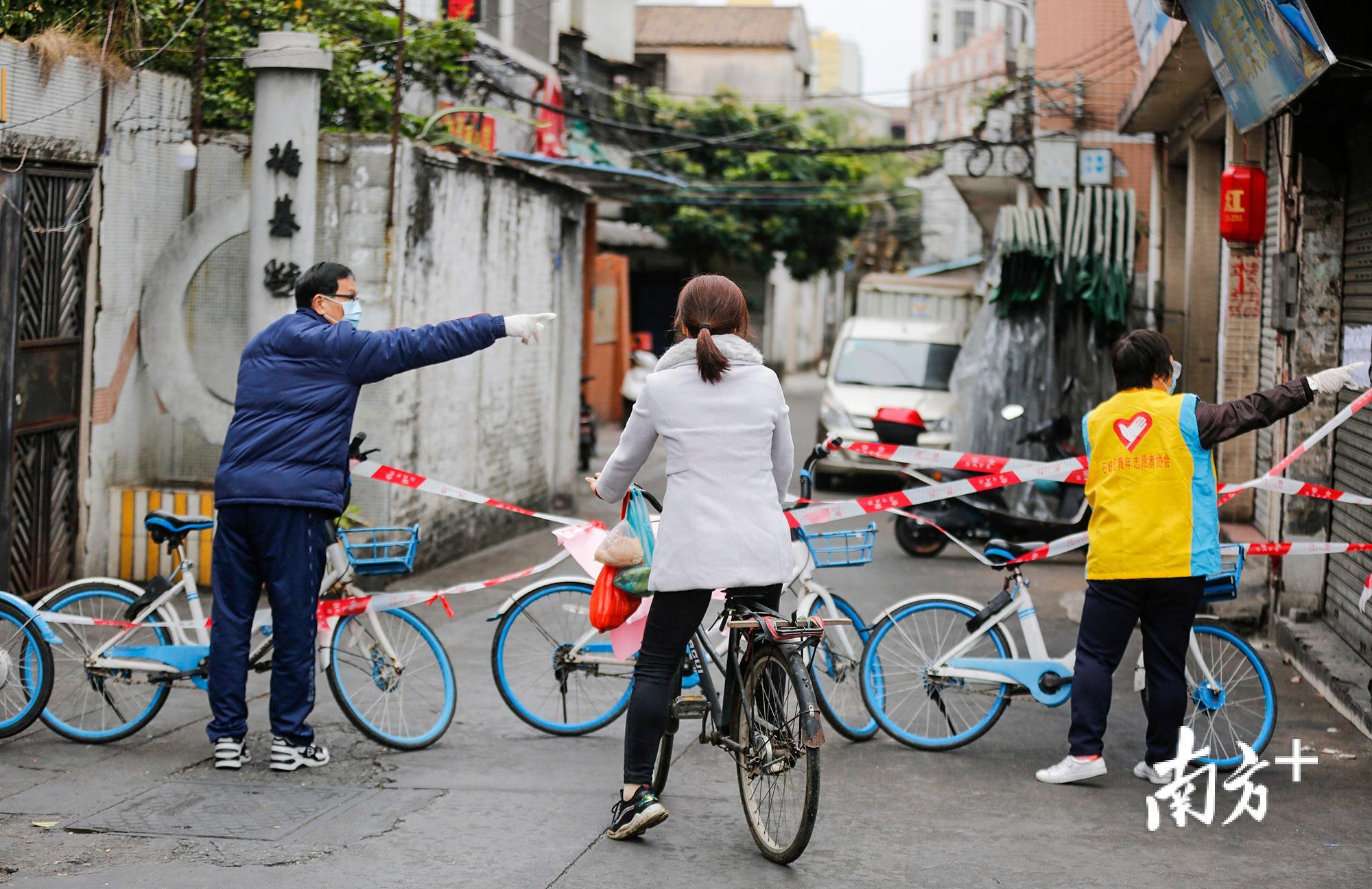 石岐区梅基街入口封闭,工作人员在指引路人从另一个入口进入。