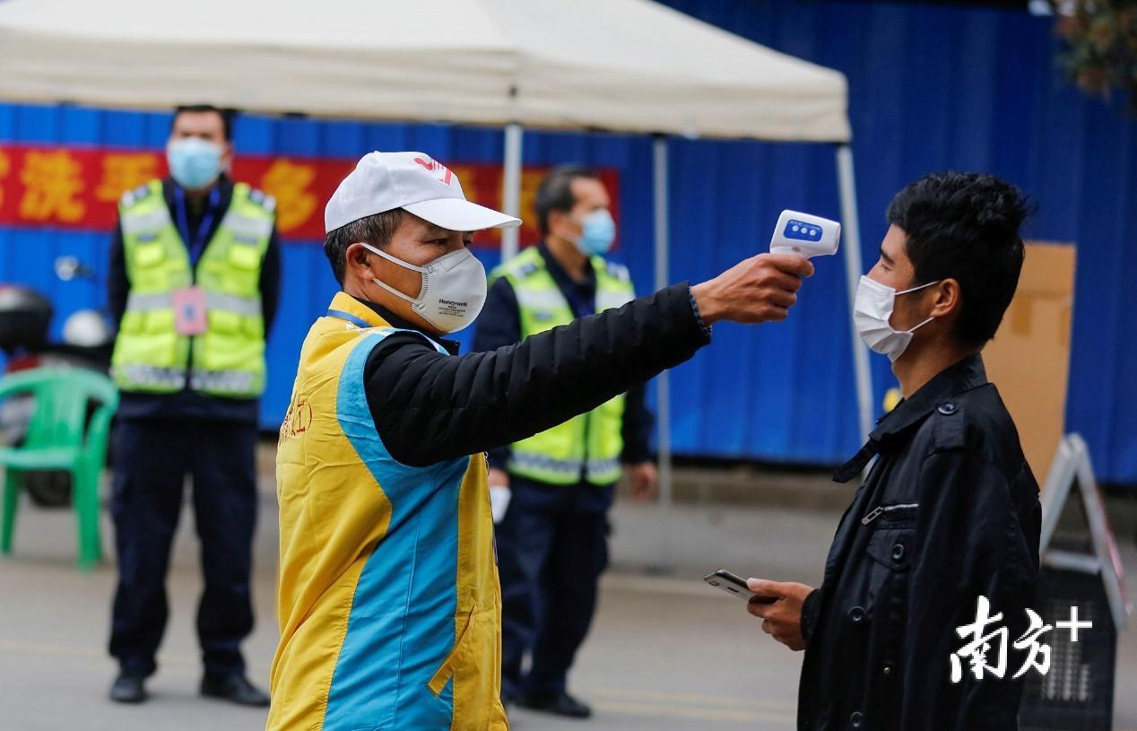 火炬开发区伟盛路,张家边社区五小组的工作人员在此设卡测量进入社区人员的体温。