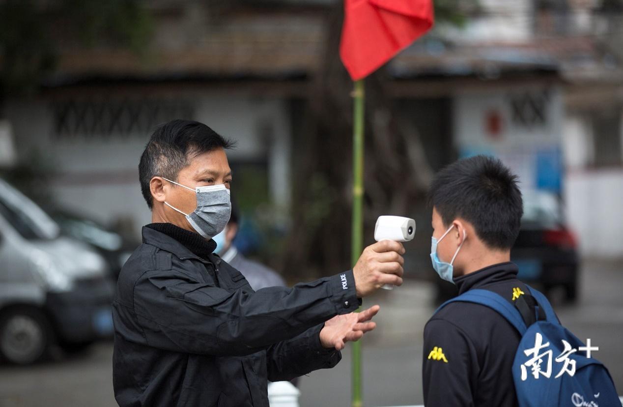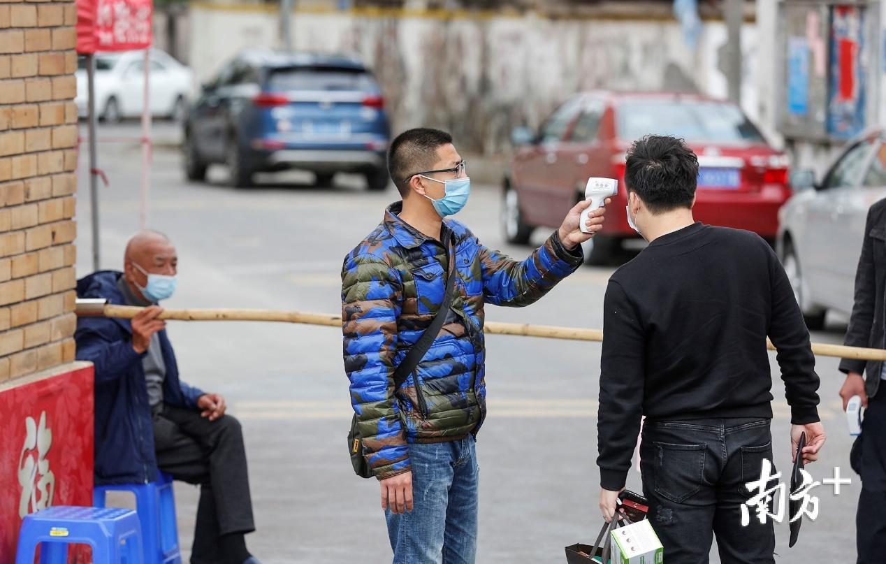 沙溪村岭后亨村,工作人员为进村人员测量体温。