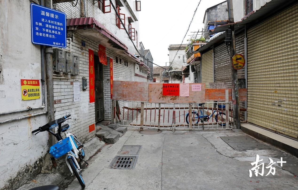 东区槎桥村旱坑正街已暂时被封闭,除了铁架,共享单车也成为了封路的工具。
