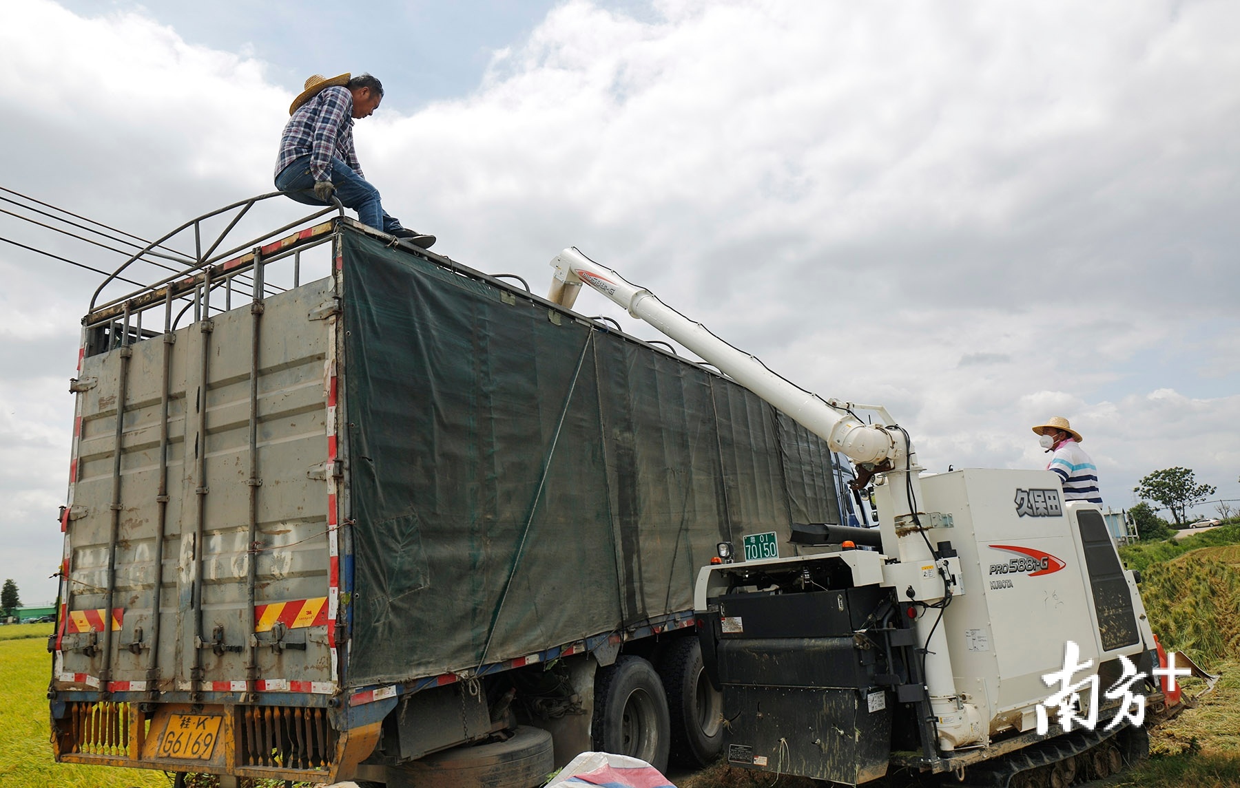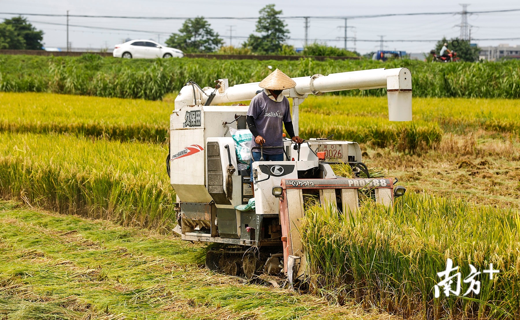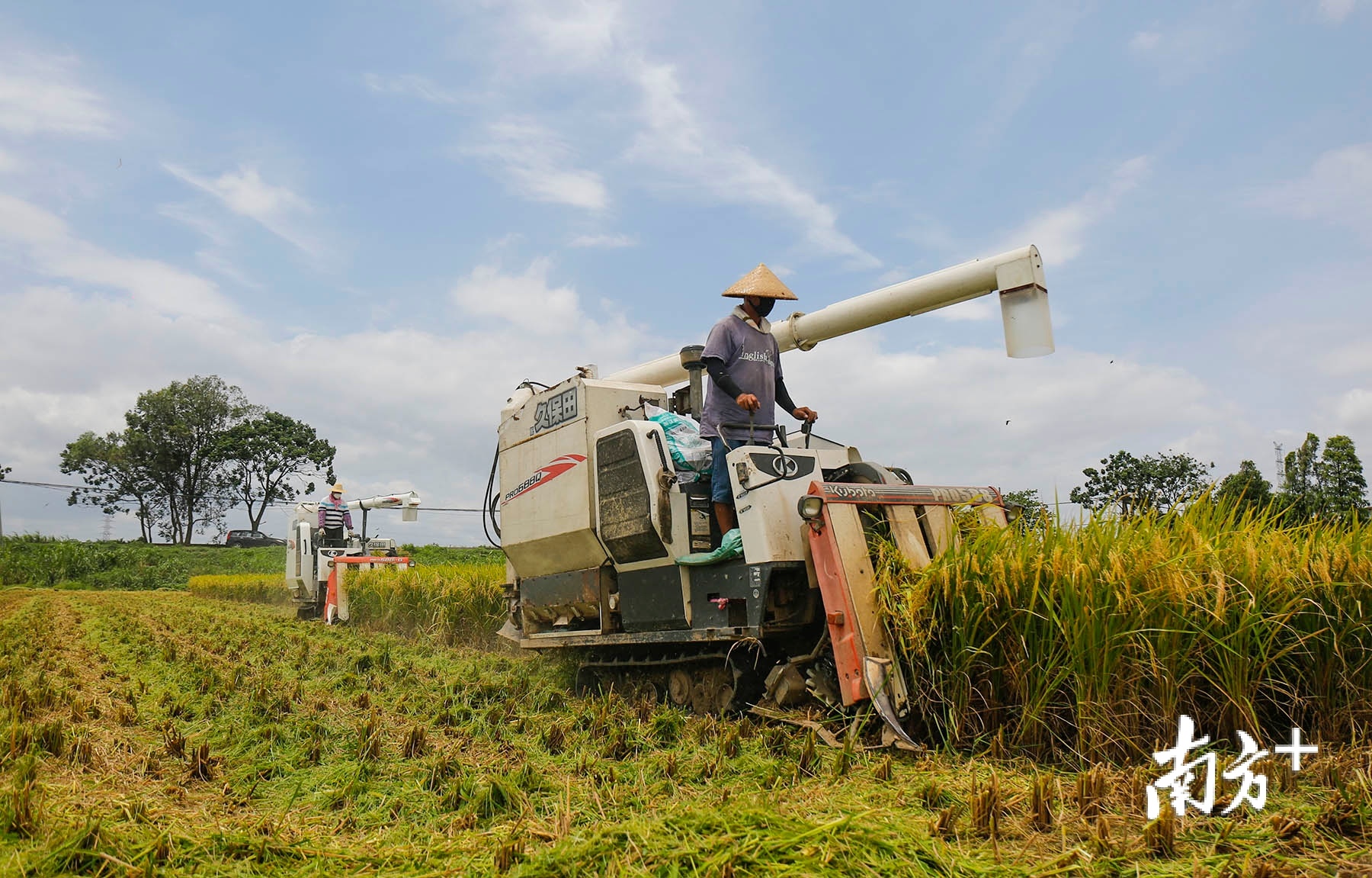 收割机在黄圃镇永平社区稻田上作业,在机械化作业情况下,百亩稻田的收割工作将在2天内完成。
