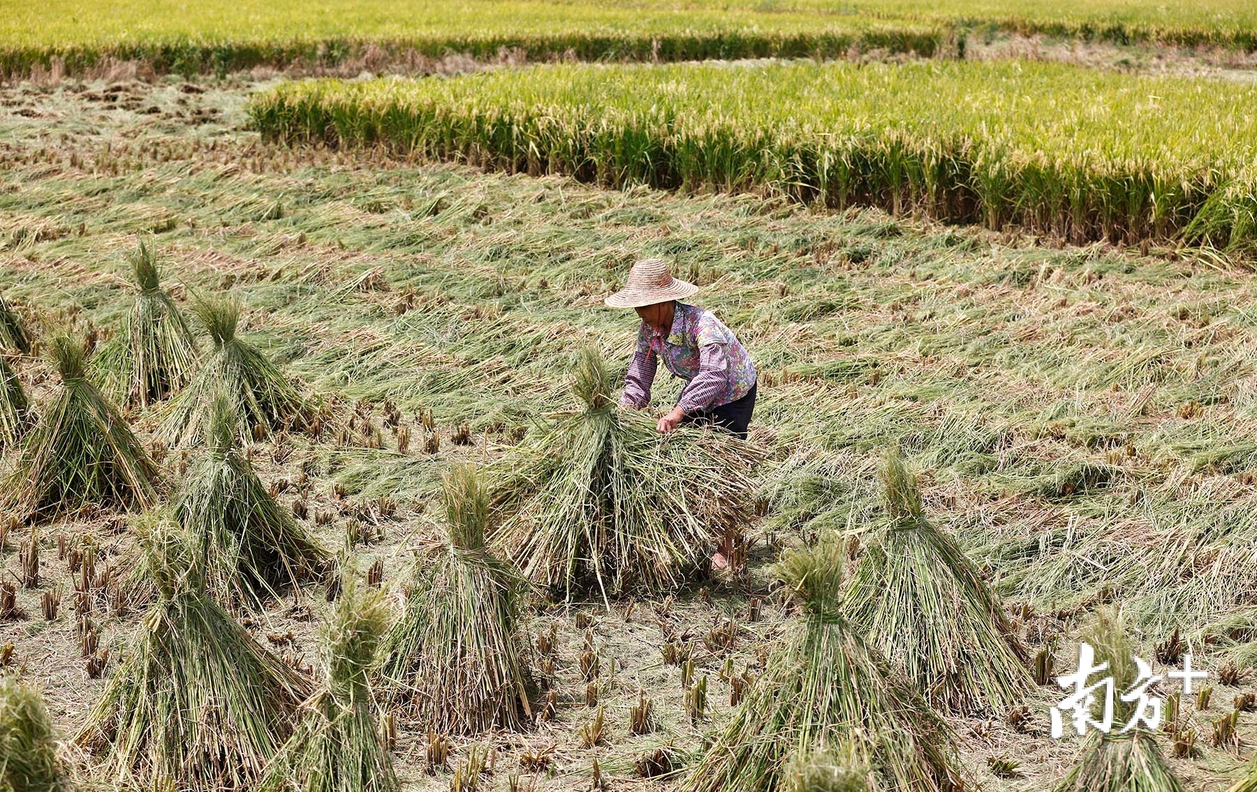 黄圃水道旁,乌珠山下,中山市黄圃镇永平社区的百亩稻田开始收割啦!
