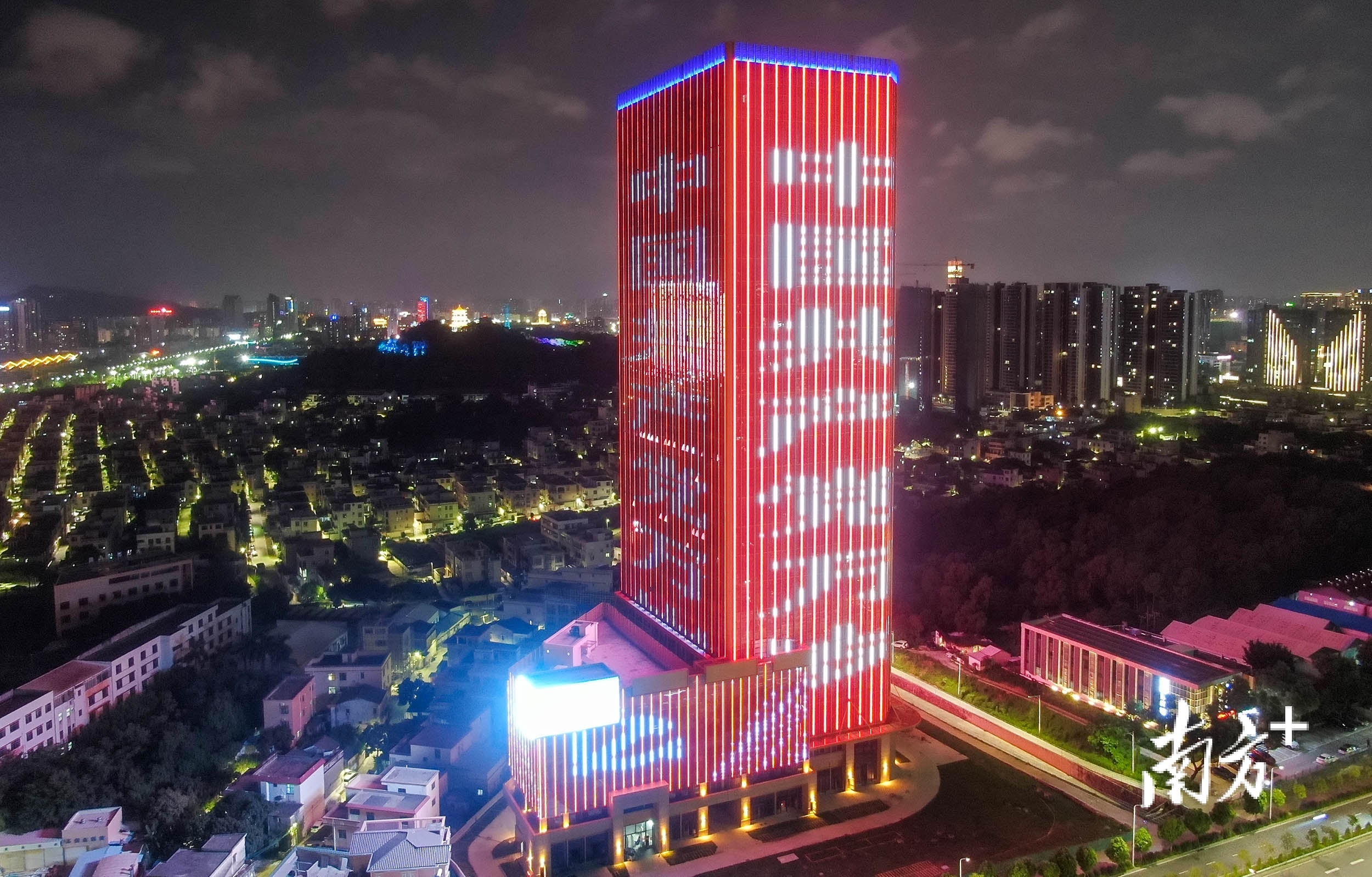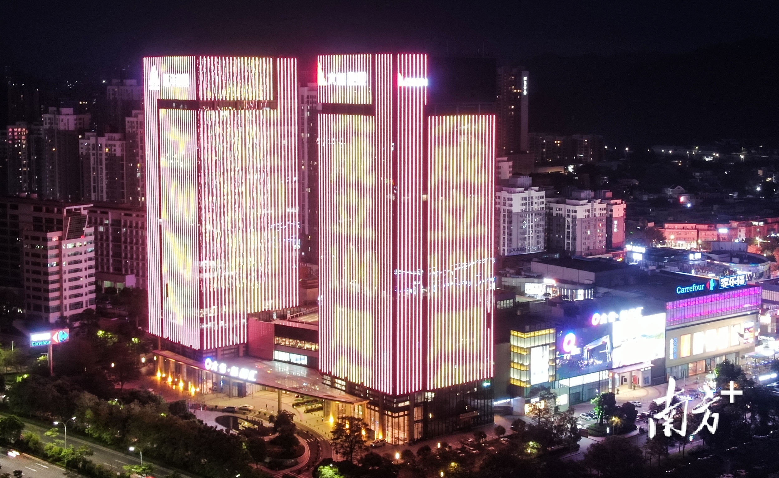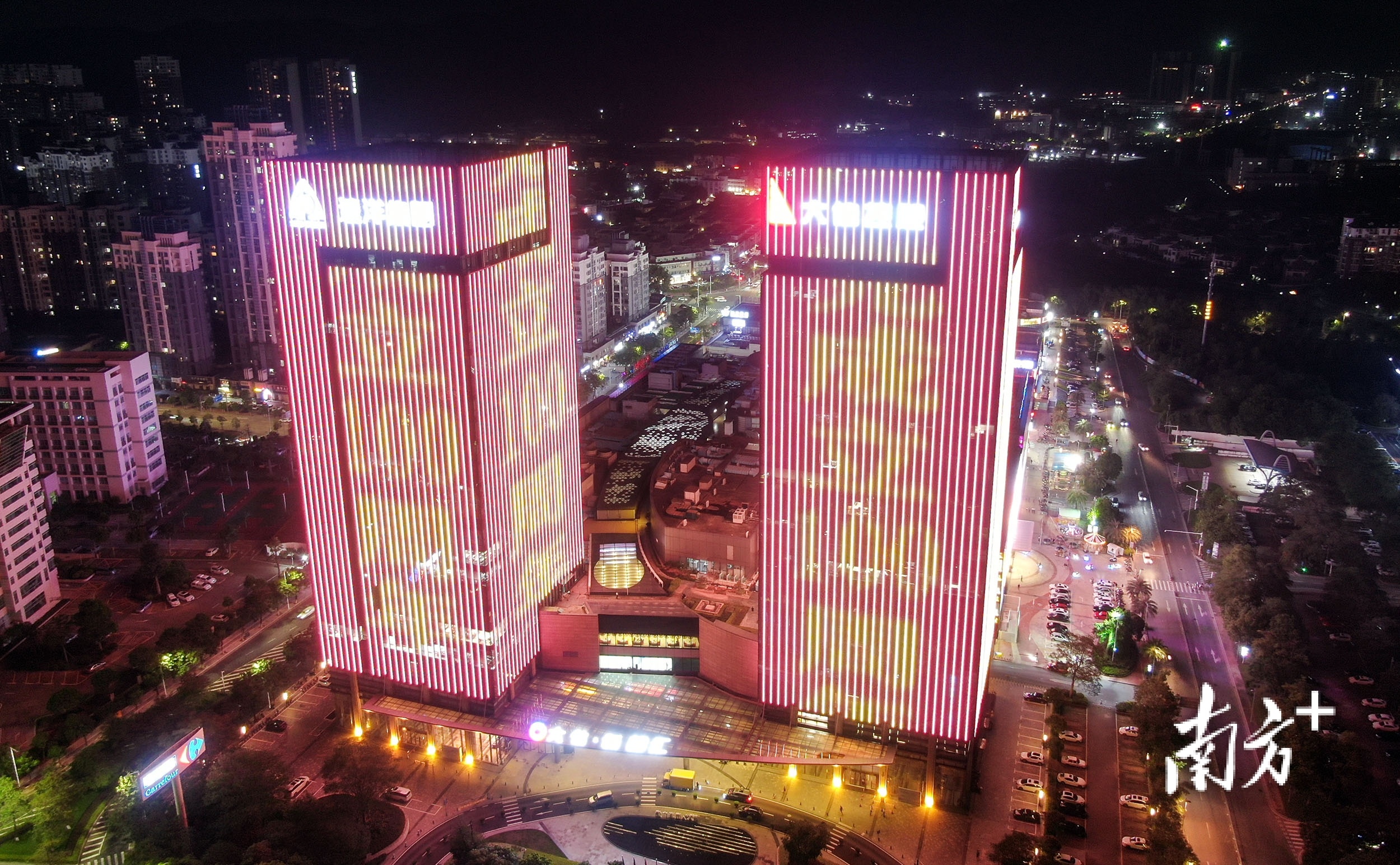 6月30日晚,中山多个地标建筑开启夜景灯光秀,巨型祝福标语点亮夜空,迎接建党百年。
