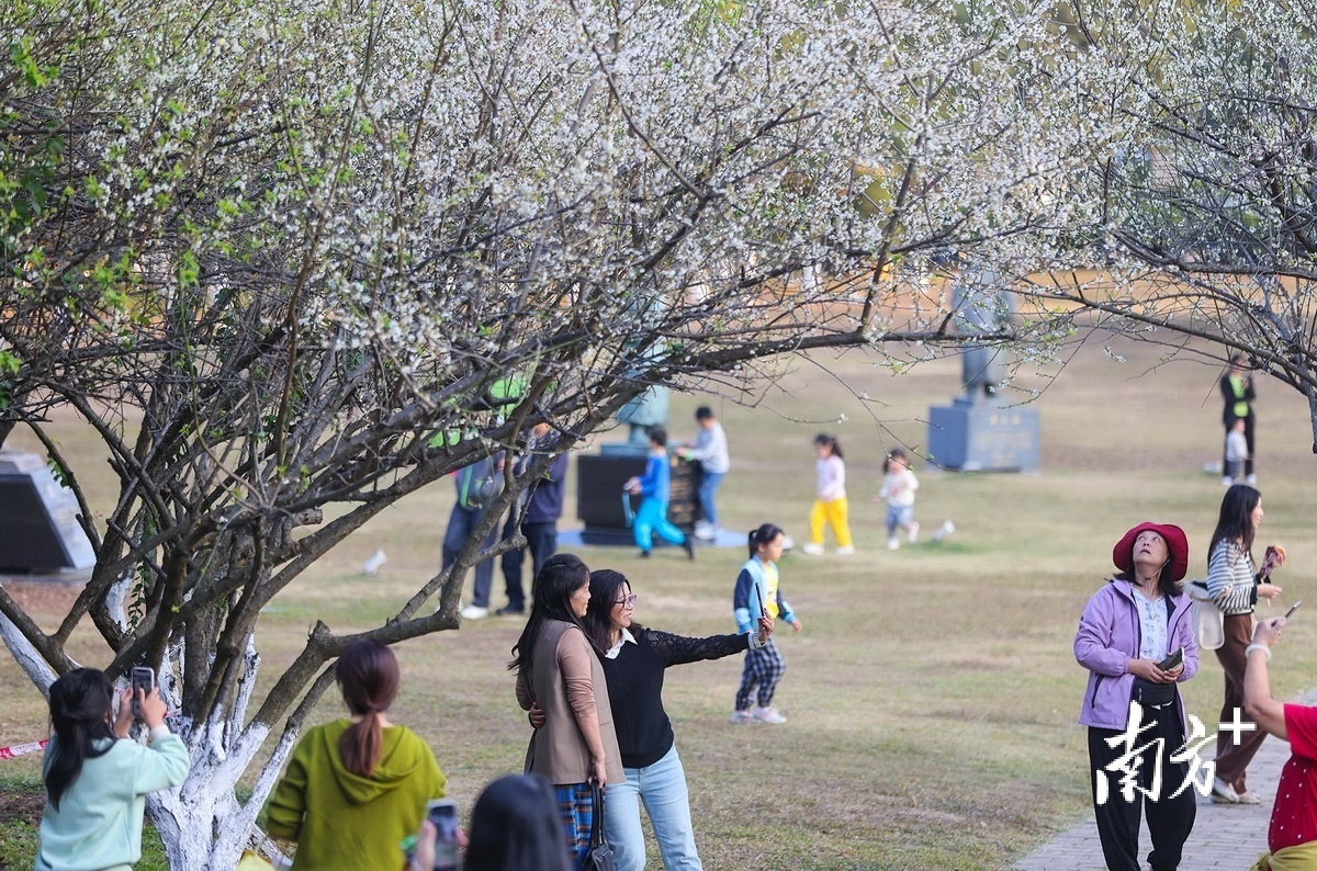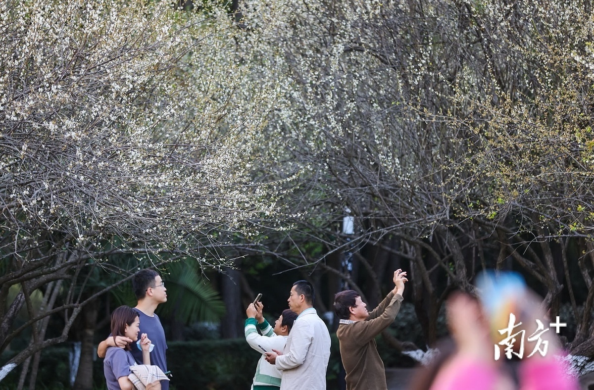 孙文纪念公园,市民纷纷拿起手机拍摄绽放的梅花。 南方+ 叶志文 拍摄