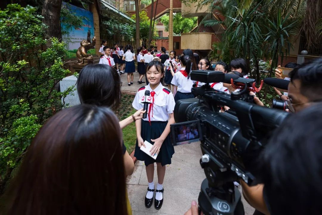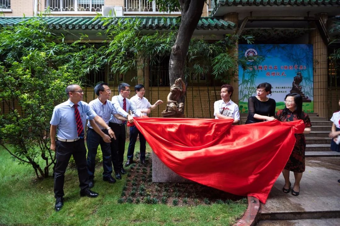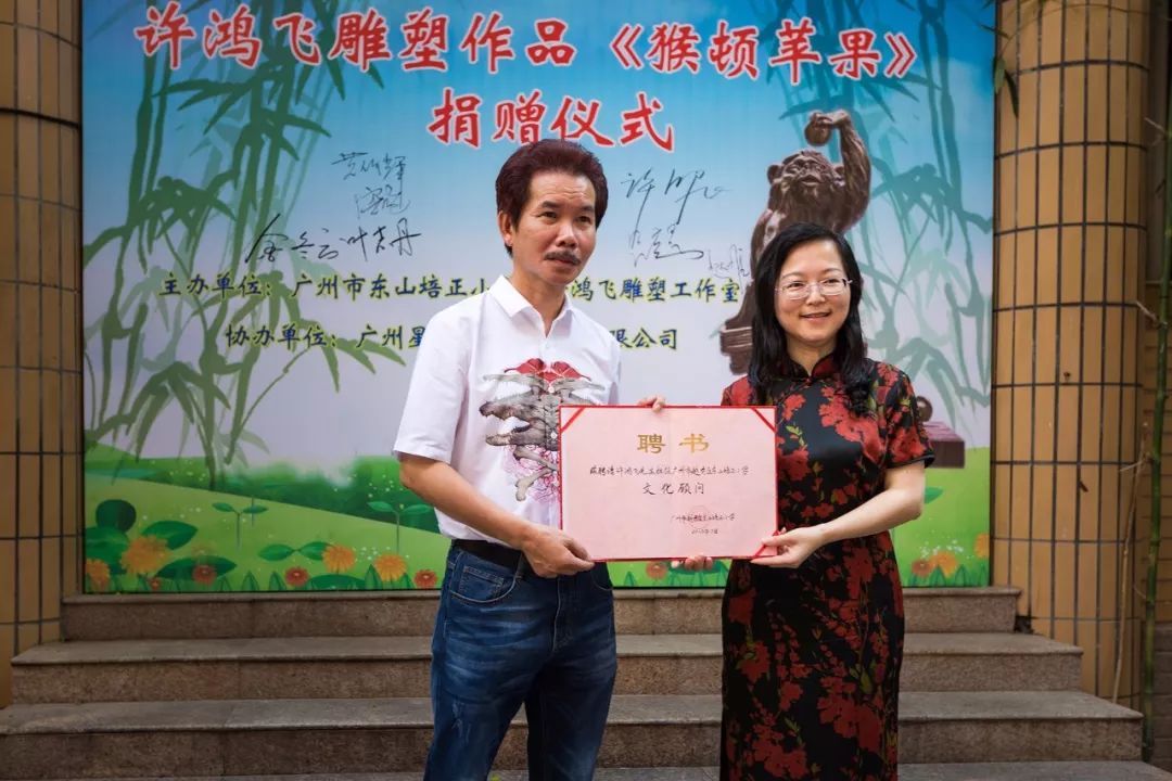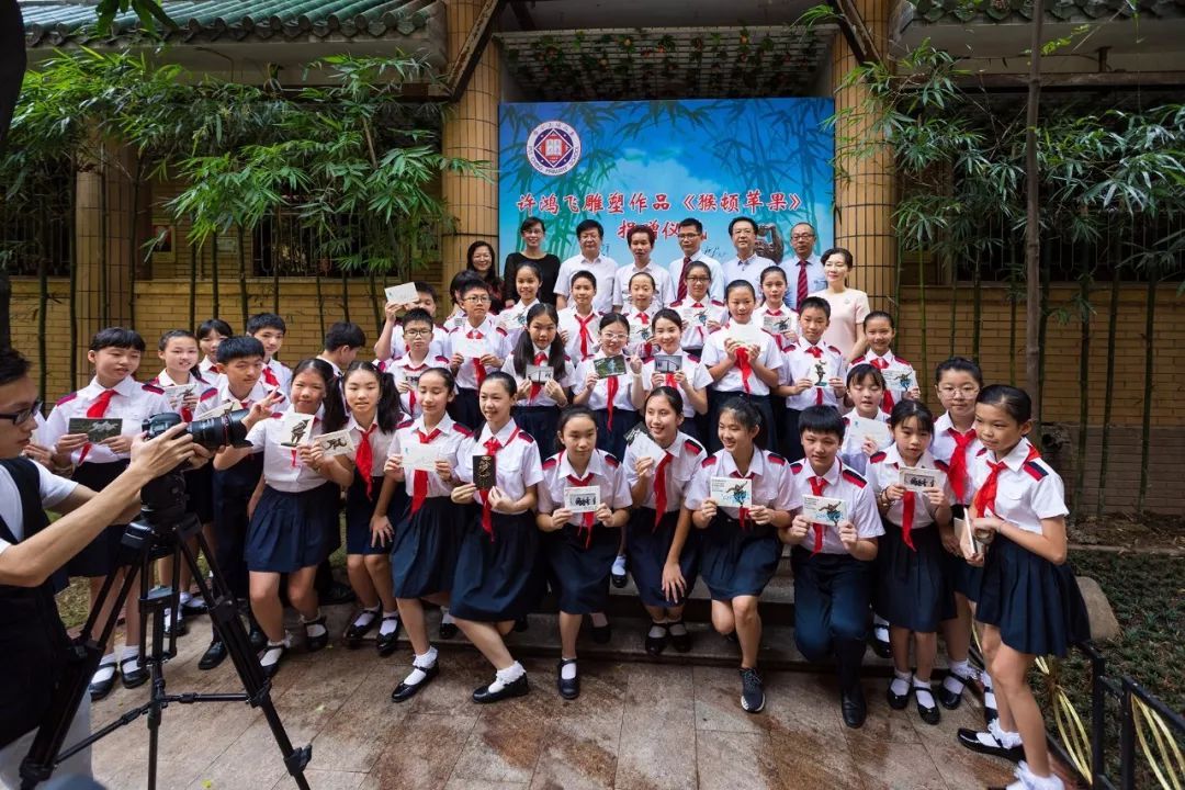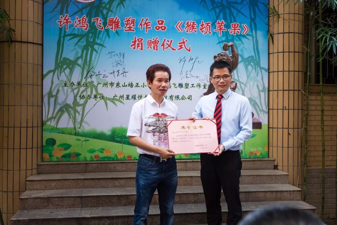 7月6日上午,广州雕塑院院长、著名雕塑家许鸿飞先生雕塑作品《猴顿苹果》捐赠仪式暨艺术作品展在东山培正小学培正路校区举行。
