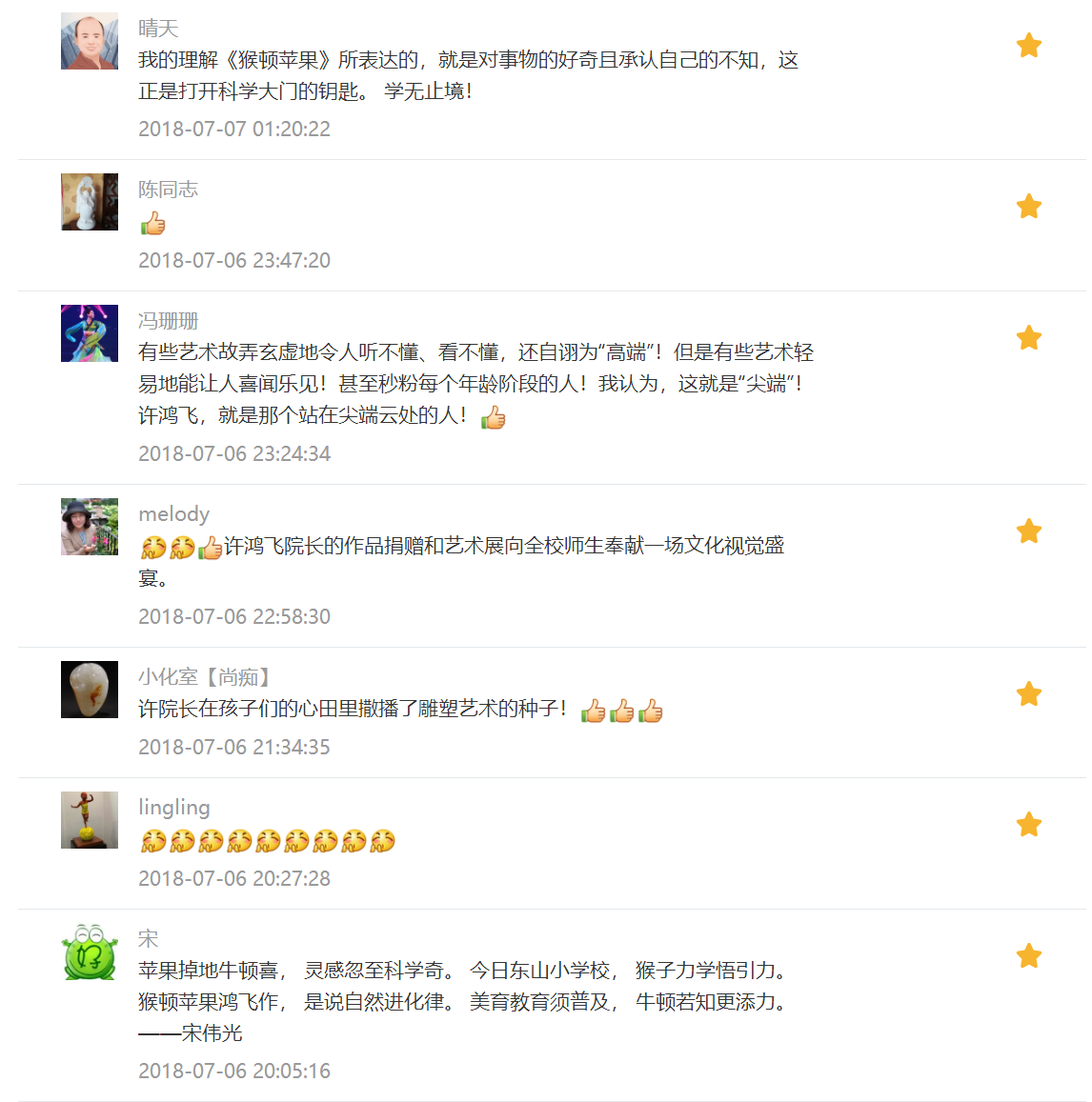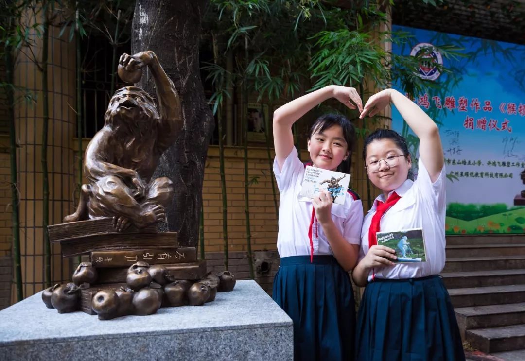 许鸿飞院长捐赠的雕塑作品——“猴顿苹果”幽默诙谐,意趣深远:手捏苹果咧嘴带笑的猴子,坐在一摞《万有引力》的书籍上。作品将猴子与现代科学的奠基人牛顿相类比,凸显出雕塑家许鸿飞一贯的戏谑风格和哲思,它印证着作者对学生们的寄望:人类的文明发展源于不断的知识积累,从猴到人的进化也是源于思考所衍生出的智慧,借此寓意求学者阅读不断,知识积累不断,从而推动人类不断进步。该作品于2016年先后落户到广州图书馆以及拥有近百年历史的广州名校执信中学校园内。