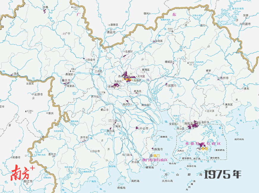 图片中飞速扩张的紫红色块足以告诉你,40多年间,随着城镇化进程的不断深入,粤港澳大湾区的“超大城市”是如何长大的。其中,东莞的城市面积增加约475倍。香港、澳门两个特别行政区的城镇化速度也非常快,城镇面积扩张为原来的5-7倍。