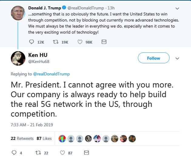 对此,华为轮值CEO胡厚崑回应称:“总统先生,我完全同意你的观点。华为随时准备好,要通过竞争,帮助美国建设起真正的5G网络。”随后,华为消费者业务CEO余承东在微博上发言:“公平竞争赢得合作与尊重,期待美国后续的行动能言行一致!”。