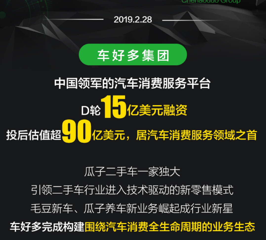 2月28日,瓜子二手车、毛豆新车网母公司车好多集团正式宣布,已完成15亿美元新一轮融资,投资方为软银愿景基金(SoftBank Vision Fund)。
