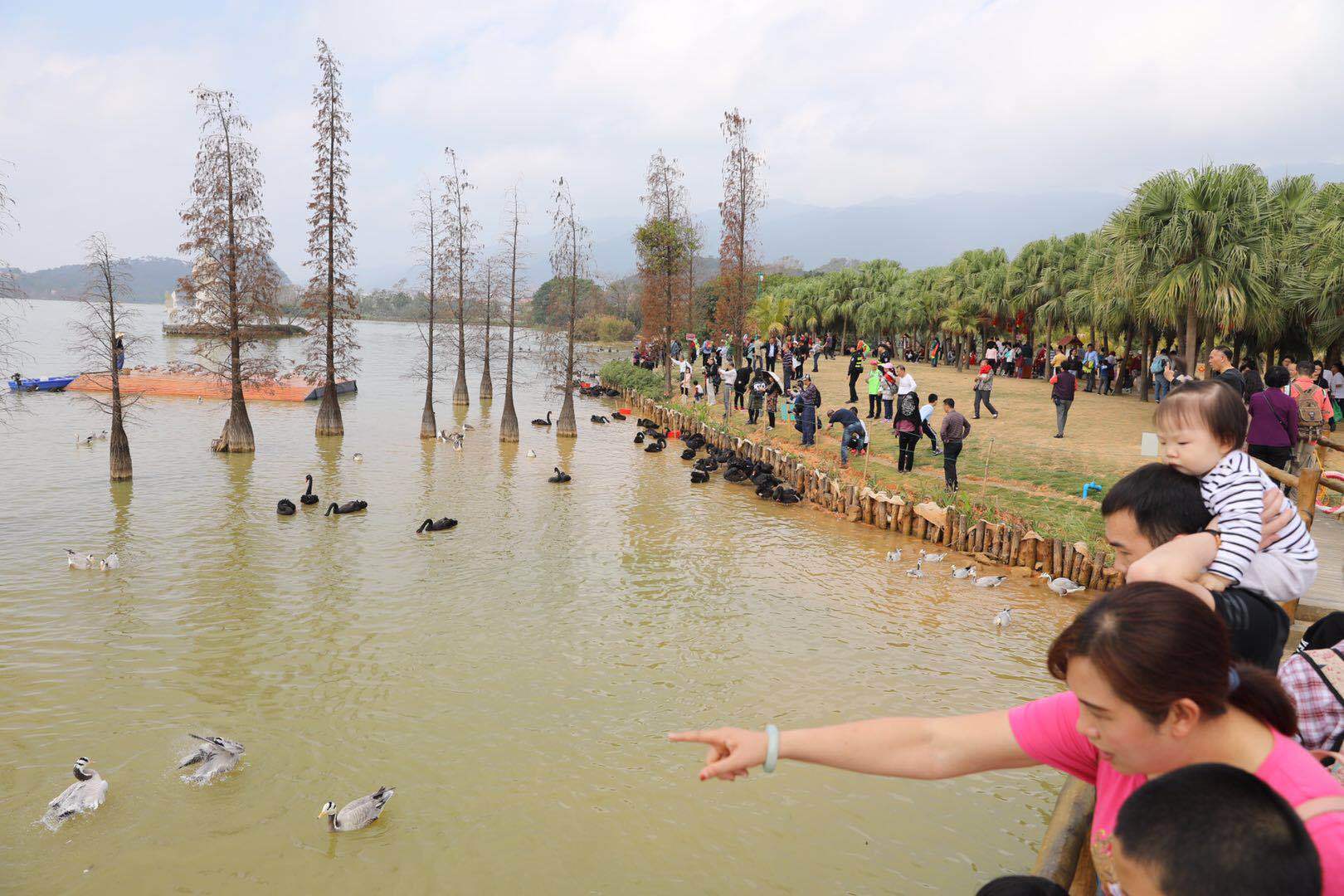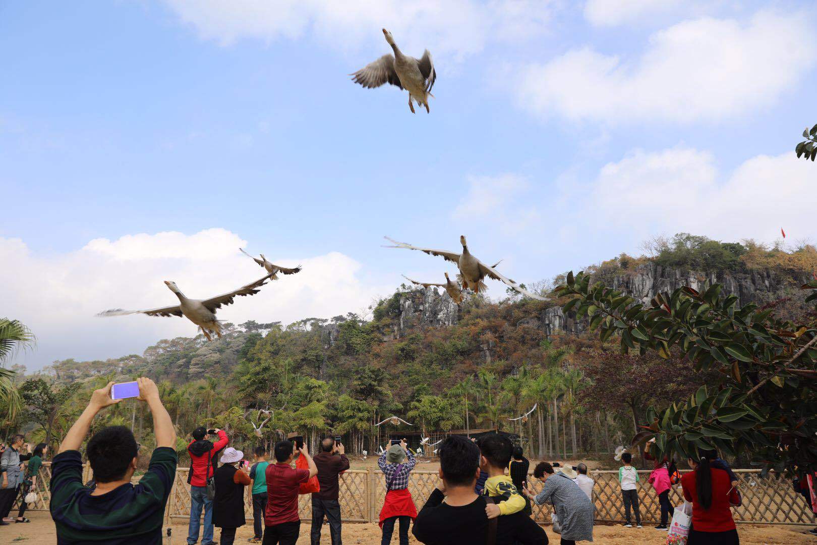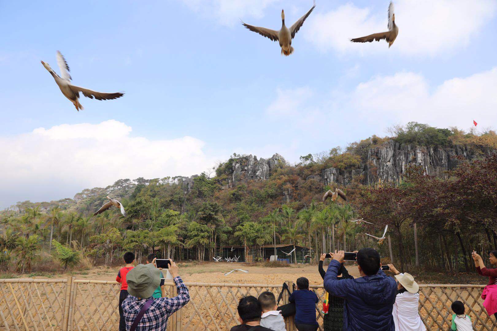 6日,年初二,肇庆星湖国家湿地公园“百鸟齐飞”项目吸引了众多游客前来观看。记者从该景区获悉,肇庆星湖国家湿地公园在原有的丹顶鹤、火烈鸟、各种水禽鹭鸟、鸬鹚等160多种禽鸟的基础上,新增加引进了黑天鹅、斑头雁、鸳鸯、鸿雁、鸳鸯鸭等近500只大中型飞禽。景区工作人员公诉记者,经过自然环境适应和人工驯养,每天放飞禽鸟,星湖国家湿地公园内逐渐形成了颇为震撼的大型禽鸟、丹顶鹤编队飞行的壮观景象,除夕至年初二三天,景区化身“百鸟天堂”,充满生机。