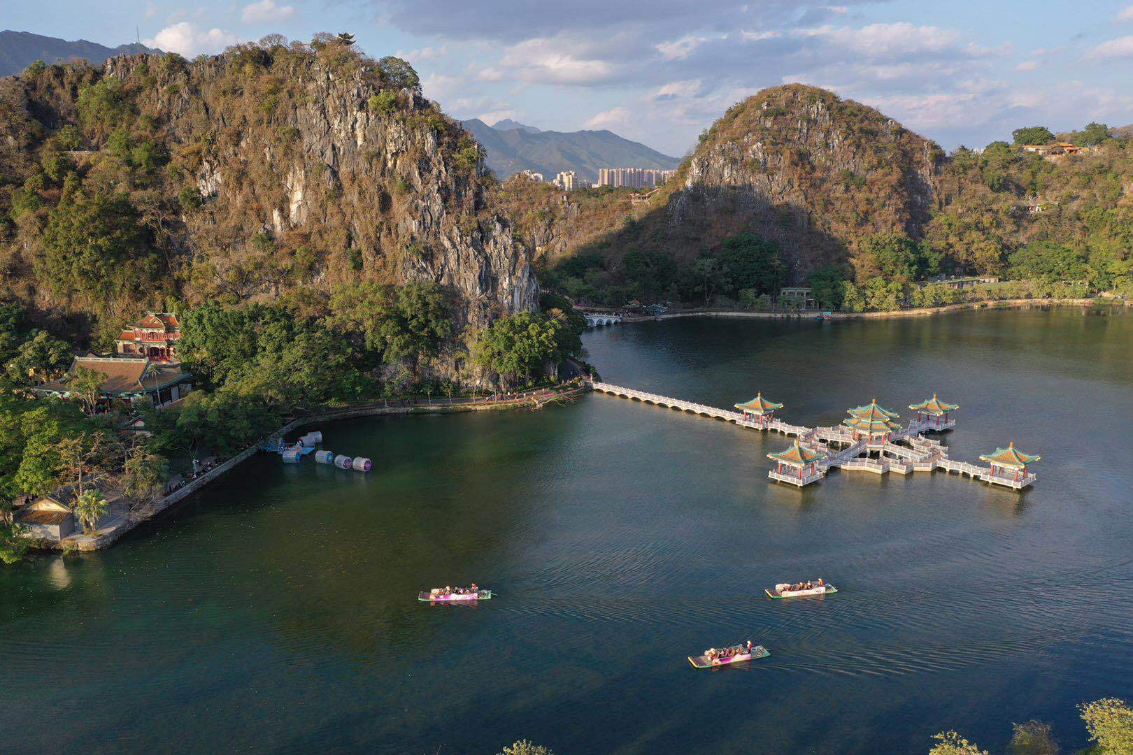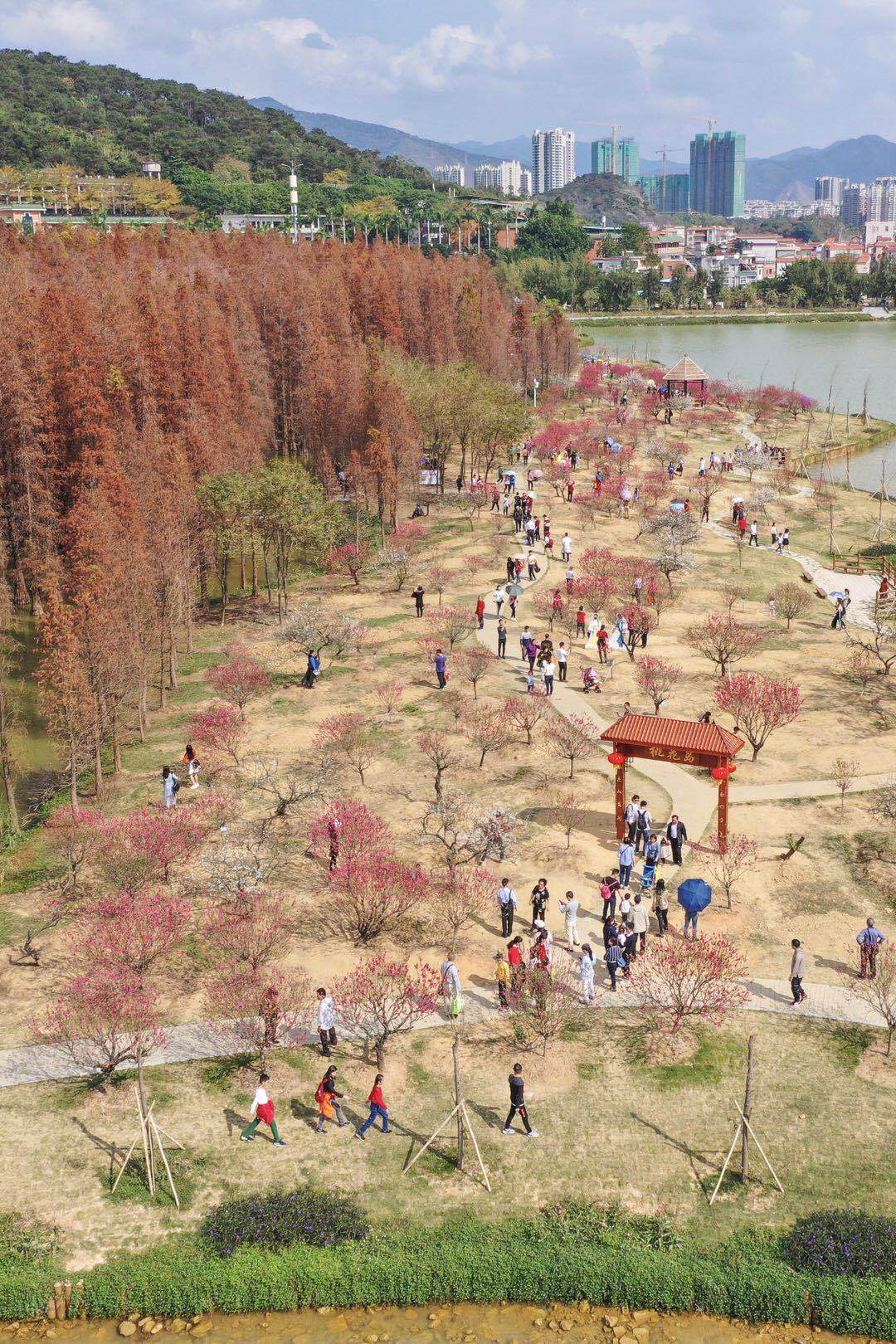 而地处七星岩景区北门,占地17亩的落羽杉林,仿若火烧云般壮丽,色彩绚烂,吸引了众多摄影爱好者的驻足,成为婚纱摄影的取景地。春节假期,落羽杉林侧的桃花岛就成为了主角,近千株桃花竞相绽放,桃红柳绿春意盎然。