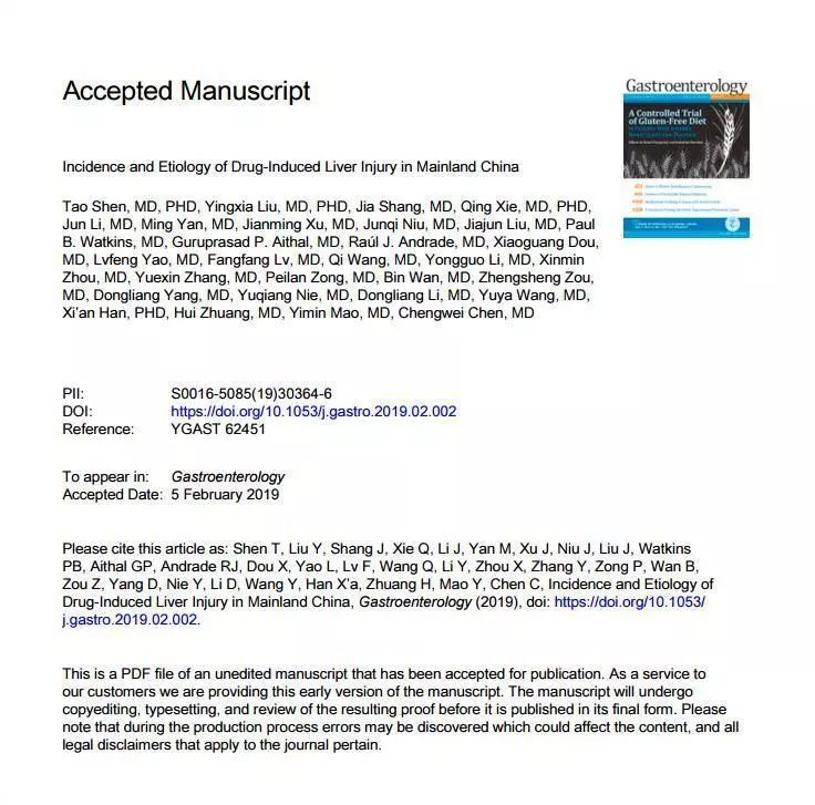 近日,上海交通大学医学院附属仁济医院消化内科主任医师茅益民和中国人民解放军第85医院陈成伟教授作为共同通讯作者,在消化疾病领域顶级期刊《胃肠病学》在线发表了题为《中国大陆药物性肝损伤发生率及病因学》的研究论文。