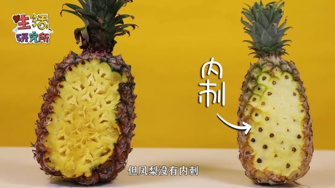 菠萝去皮之后,里面还是会有内刺的,所以一般食用都会削出一道一道痕。而凤梨去皮后里面没有内刺。