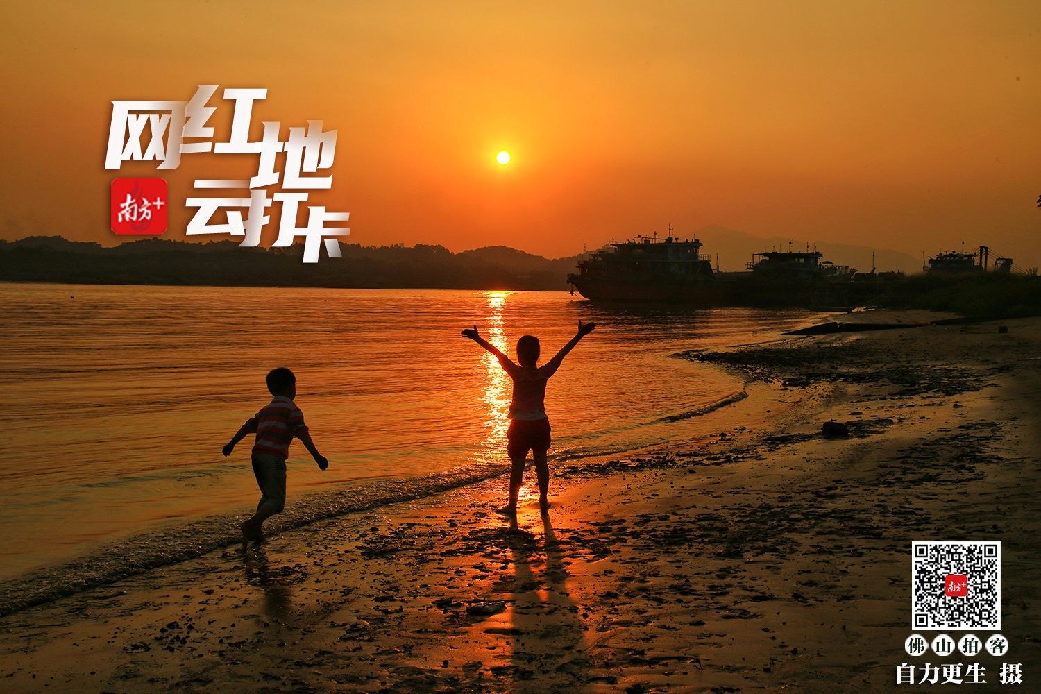 ▲三水河口北江边上,海面被披上了一层红橙相间的晚霞,小孩站在霞光的倒影下张开双臂,作出拥抱的姿势。