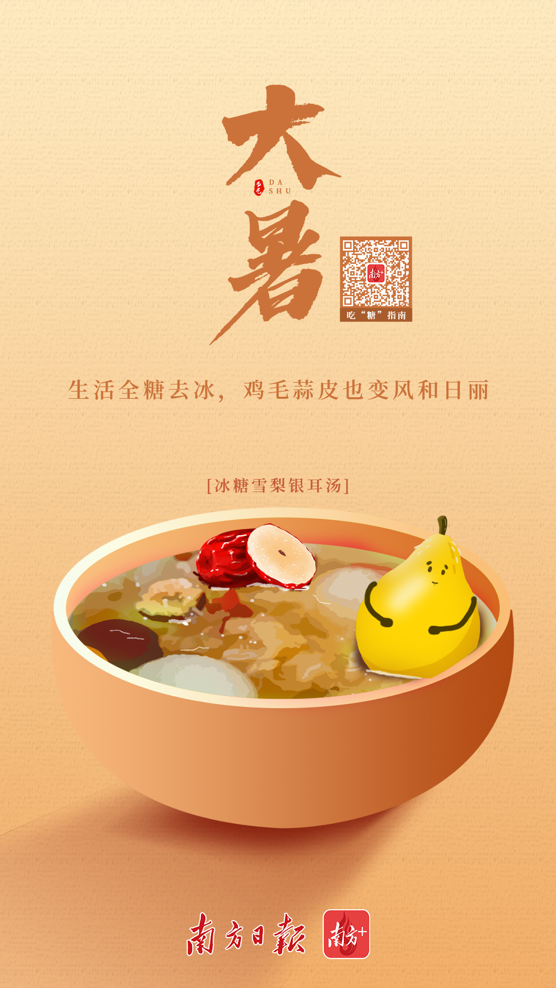 大暑乃一年中的至热之日,及时补水尤为重要。一碗冰糖银耳炖雪梨,生津润肺、清热解毒、止咳化痰、利咽降浊,驱逐渴意,甜入心头。