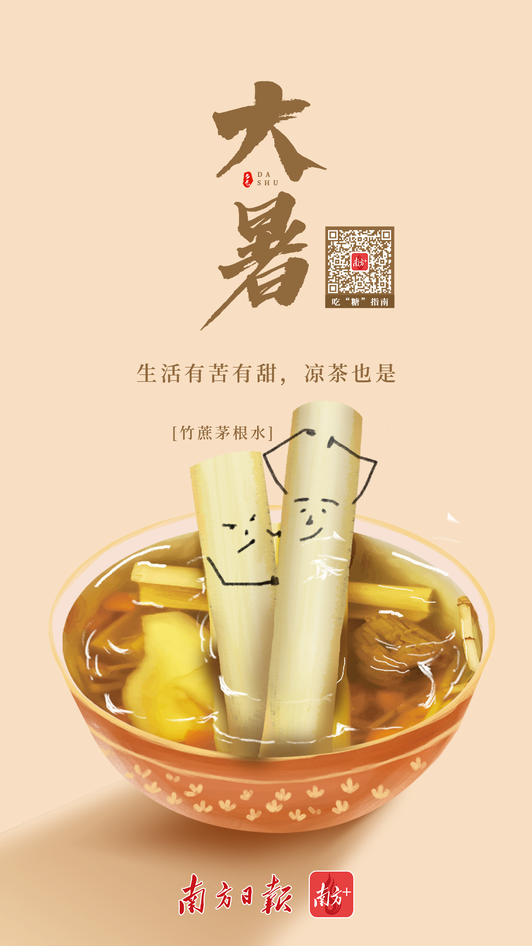 天热口味淡,贪吃辛辣、煎炸、重口食物易上火,来一杯凉茶刚刚好。茅根竹蔗水,清润解毒,清热利尿。凉茶不苦,但不要贪杯哦。