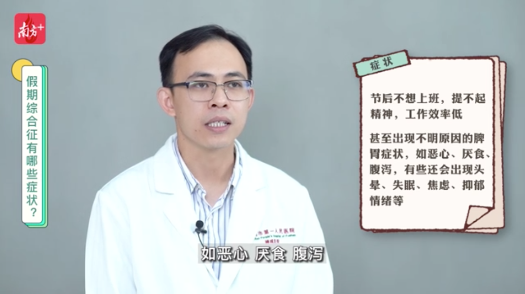 假期综合征又叫节后综合征,是指放完假之后上班或者上学出现各种心理或者生理的波动。节后出现不想上班,提不起精神,工作效率低,甚至出现不明原因的脾胃症状,如恶心、厌食、腹泻。有些还会出现头晕、失眠、焦虑抑郁情绪等。