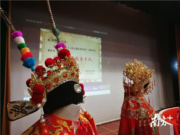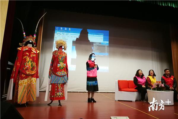 “驸马的帽子有长长的翎子,公主穿的是凤冠霞帔……”,舞台上,博罗县园洲镇曲艺协会秘书长朱钻娣将传统粤曲服饰摆上台,并细致介绍这两套服装的相关知识,让与会人员感受到这一当地传统文化的魅力。