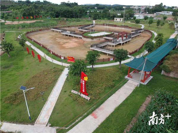 党建公园里的池塘里没有水。之前种植下的荷花,已经在淤泥上露出了几片叶子。“最近暴雨多,前一阵池塘的水都溢出来了。”当地村民说,为了避免突如其来的暴雨,池塘的水放掉了。