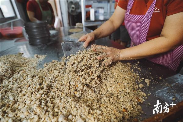 与旧时不同,如今陈师傅制作月光饼的原料还增加了黑芝麻、芝麻仁、冬瓜丁、白砂糖、花生油等。这些材料全部炒熟并翻拌均匀,无须经过烘焙程序,简单的压制结实、倒模成形,月光饼就诞生了。因此,相较于其他重油重糖的月饼,这样的月光饼就也少了几分油腻,多了一丝清香。