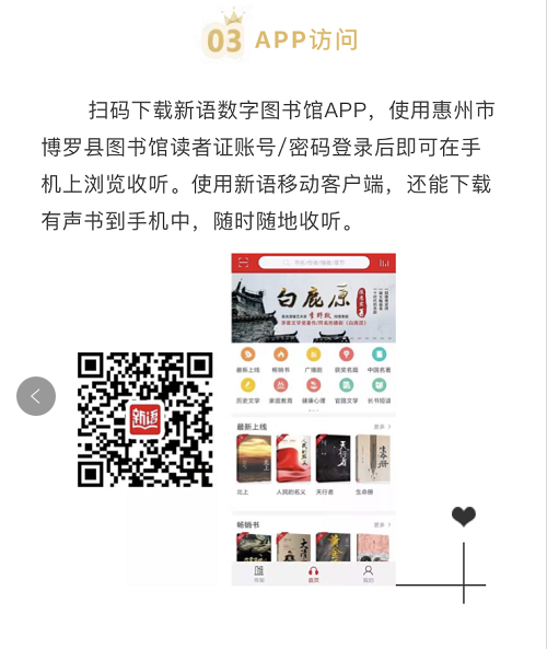 目前,该线上阅读平台已上架了最新出版的防疫指引、经典名著、社科哲学、文学语言等多种类型的电子书目,百姓只需关注惠州市博罗县图书馆微信公众号、扫描二维码进入“新语数字图书馆”小程序或者用手机下载新语数字图书馆APP,就能足不出户尽情畅游书的“海洋”。