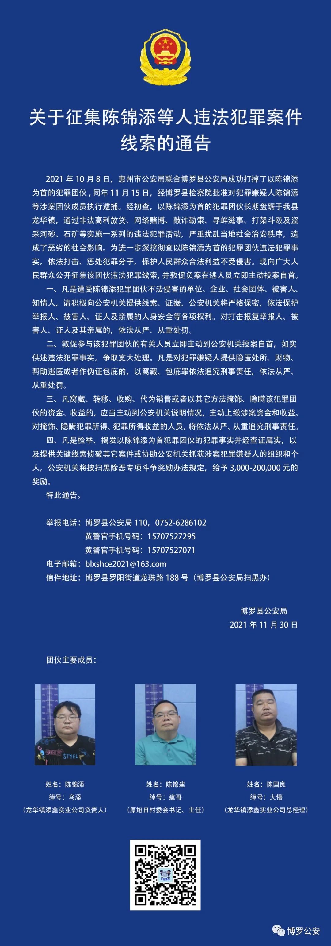 近日,博罗县公安局发布“关于征集陈锦添等人违法犯罪案件线索的通告”(下称“通告”)。通告指出,今年10月,惠州市公安局联合博罗县公安局成功打掉了以陈锦添为首的犯罪团伙。11月15日,经博罗县检察院批准对犯罪嫌疑人陈锦添等涉案团伙成员进行逮捕。