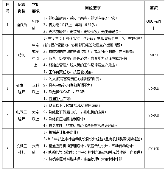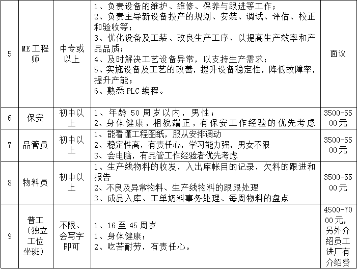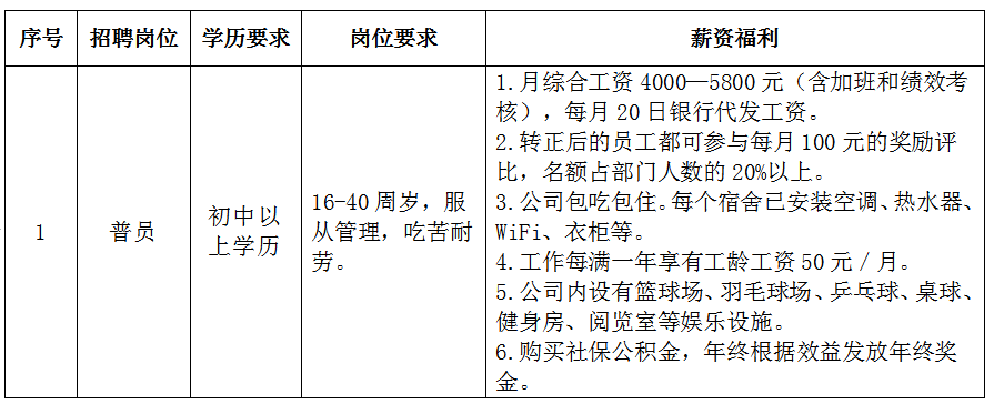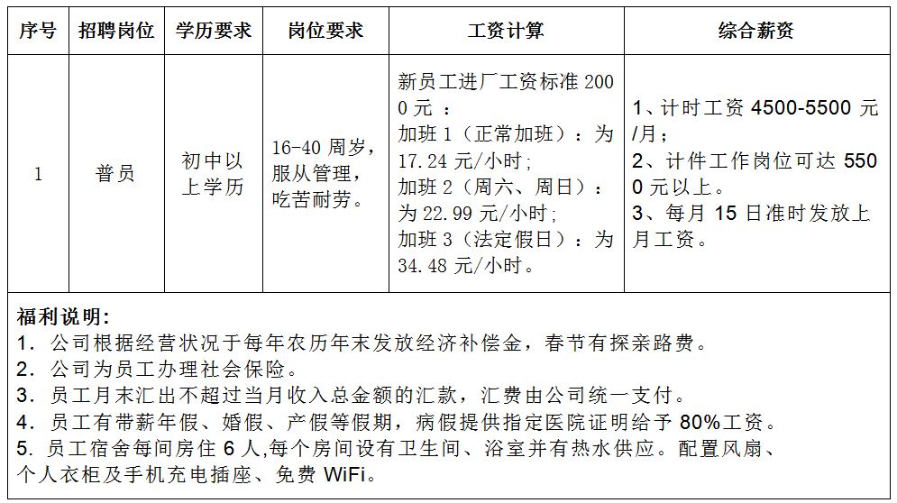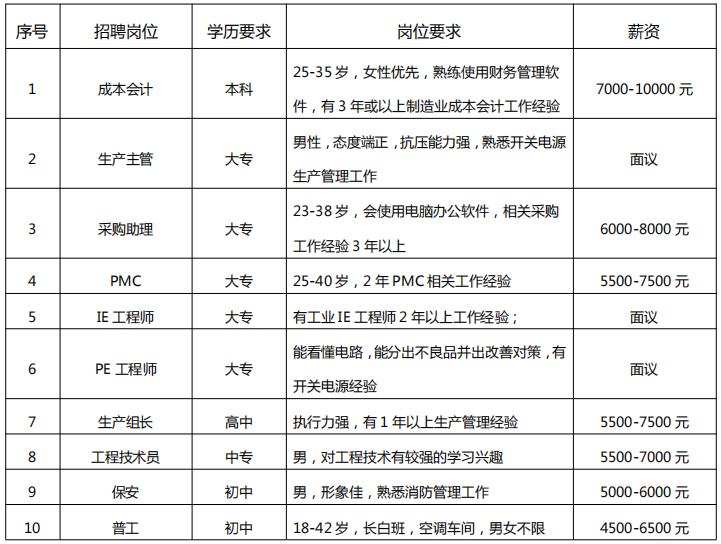 田村电子(惠州)有限公司系2002年成立的日资集团独资公司,位于惠州市博罗县罗阳街道鸿达工业园,主要生产高低频变压器、充电器等。该公司因扩大生产,现面向社会招收大量男、女工,要求如下: