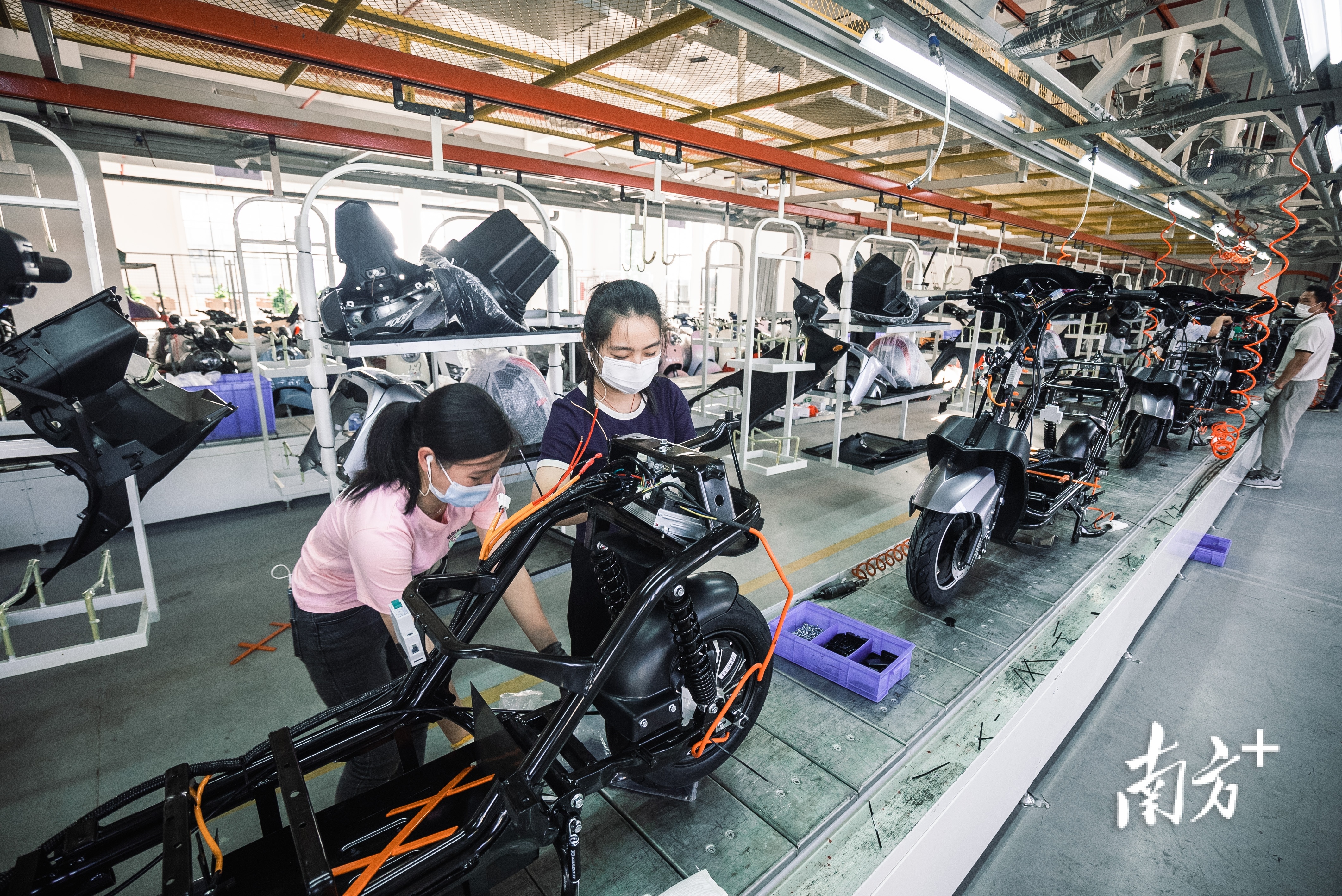在位于博罗县龙华镇的广东小刀新能源科技有限公司生产车间里,从预装到整装,一辆电动车通过一条全长约120米的自动化流水生产线后最终成型。在这样一个车间里,每天大约有1000台电动车整车组装完成。在随后的下线检测环节中,检测员对于车辆的轮胎、刹车、减震、转把、以及淋水、负载等进行承重测试,通过测试的车辆才能被打包发货。