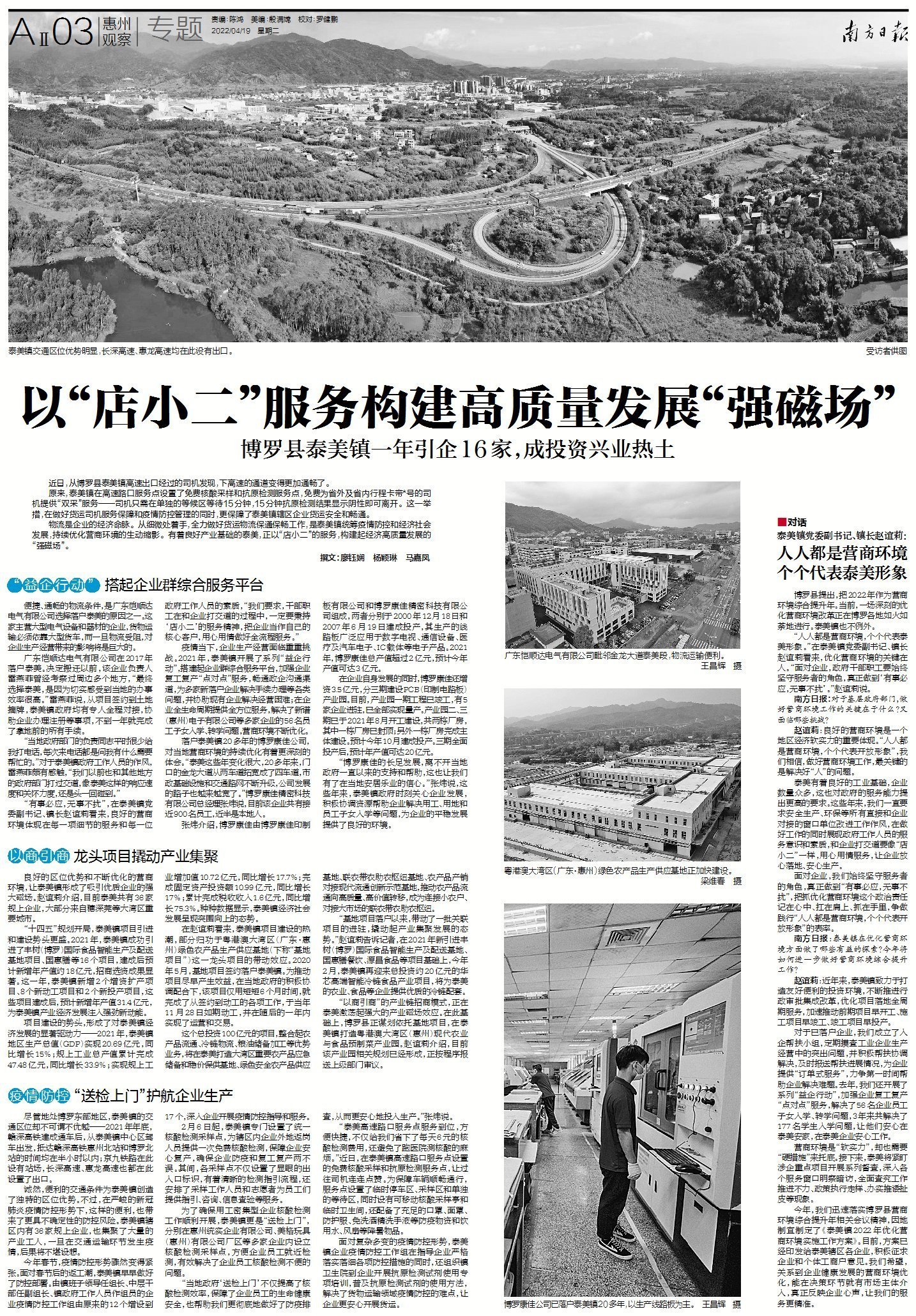 疫情当下,企业生产经营面临重重挑战。2021年,泰美镇开展了系列“益企行动”,搭建起企业群综合服务平台,加强企业复工复产“点对点”服务,畅通政企沟通渠道,为多家新落户企业解决手续办理等各类问题,并协助现有企业解决经营困难;在企业全生命周期提供全方位服务,解决了新谱(惠州)电子有限公司等多家企业56名员工子女入学、转学问题,营商环境不断优化。