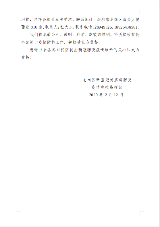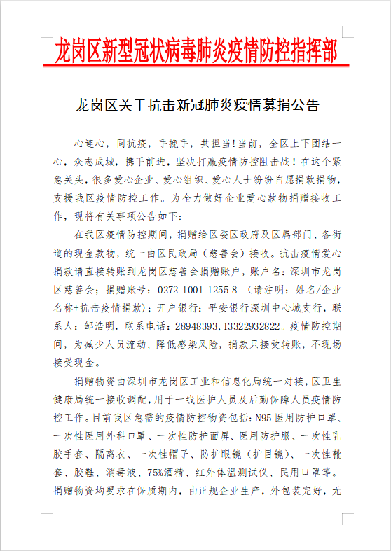 为全力做好企业爱心款物捐赠接收工作,2月12日,龙岗区新型冠状病毒肺炎疫情防控指挥部向全社会发布《关于抗击新冠肺炎疫情募捐公告》,明确在龙岗区疫情防控期间现金款物、物资捐赠统一对接单位,号召社会各界伸出援手、广施博爱,共同为打赢疫情防控攻坚战出一份力、发一份热。