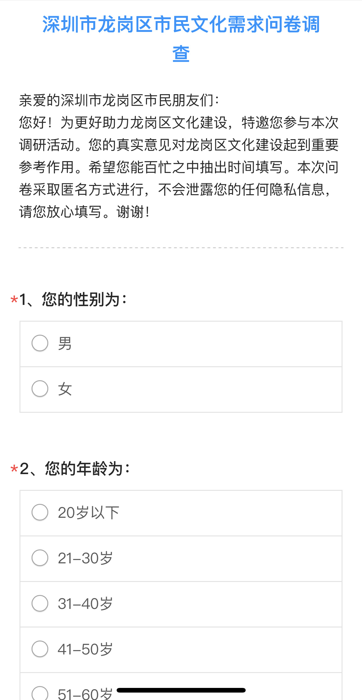 龙岗区现面向市民朋友开展问卷调查,通过全面了解市民群众文化需求,补足短板、优化工作,不断提升公共文化服务品质,满足市民文化生活新期待,打造深圳都市圈东部文化中心和国际文体活动交流中心。
