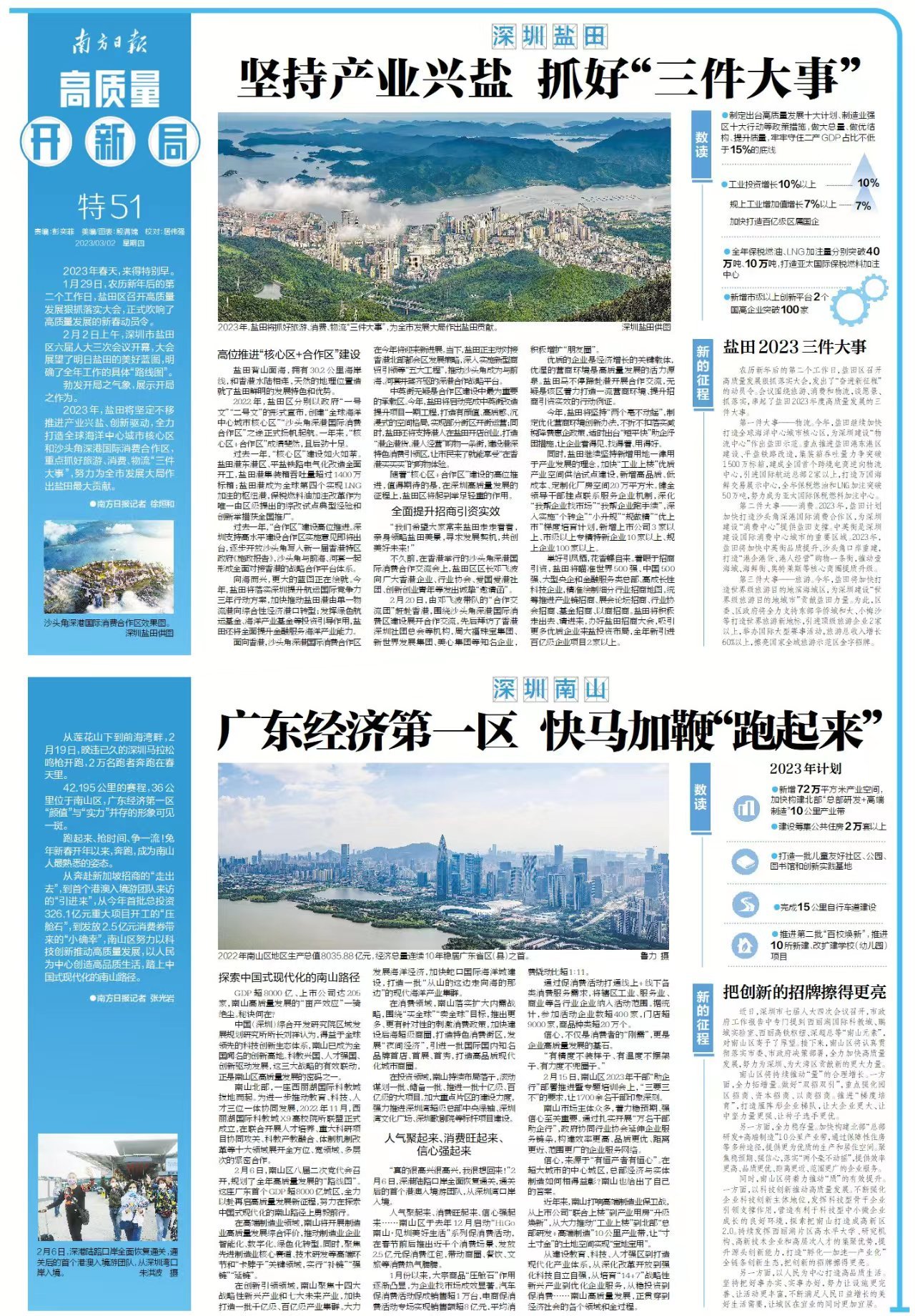 2023年,盐田将坚定不移推进产业兴盐、创新驱动,全力打造全球海洋中心城市核心区和沙头角深港国际消费合作区,重点抓好旅游、消费、物流“三件大事”,努力为全市发展大局作出盐田最大贡献。