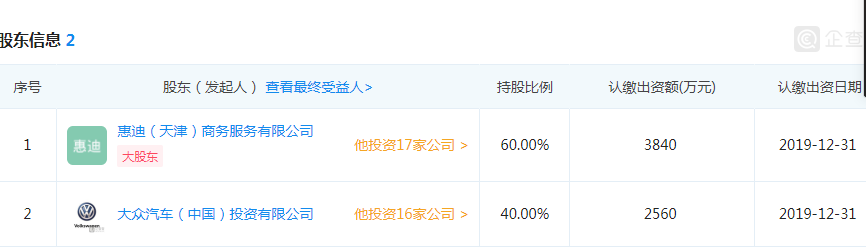 据企查查,大众汽车(中国)投资有限公司和惠迪(天津)商务服务有限公司于2018年12月14日合资成立了上海桔众汽车科技有限公司(下称桔众汽车),其中,前者持股比例为40%,后者持股比例为60%,注册资本6400万人民币,注册公司地址在上海嘉定区。