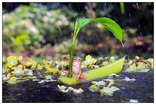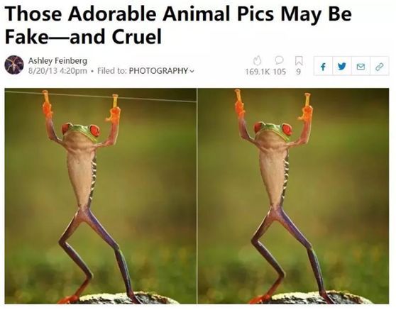 这组雨中树蛙的照片,就被曝出是被拍摄者用胶水粘住青蛙,插上树叶,然后洒水制造下雨效果的摆拍。
