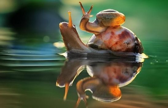 很多小动物在惊吓和疼痛中死去。照片拍完了,他们被丢弃到一边,自生自灭。比如这张所谓的《母子同心过河》,其实根本不是母子,而是两种不同的蜗牛,重要的是,过河它们会淹死。