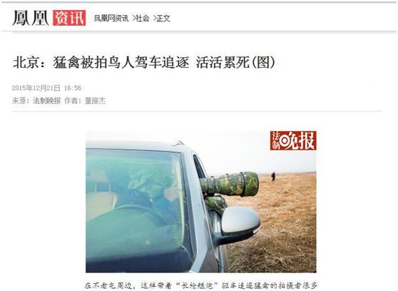2015年北京护鸟志愿者联盟发布的《关注北京冬季猛禽的生存》中记录了这样的一场悲剧:“一只雕鸮的亚成鸟被发现后,成为竞相追逐的目标。为获得各种姿态和角度的照片,摄影者不断抵近,使劲追赶。最终雕鸮精疲力竭,再也飞不动了,后被其中一名拍鸟人送到北京猛禽救助中心。但它还是没能挺过去,于2015年11月23日去世。”