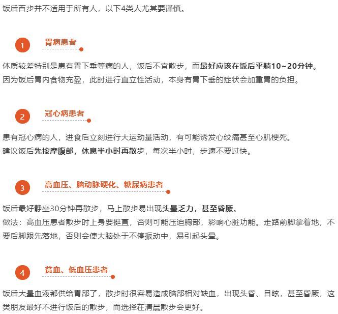 适合人群:“饭后百步走”比较适合平时活动较少,特别是长时间伏案工作的人,也适合形体较胖或胃酸过多的人。
