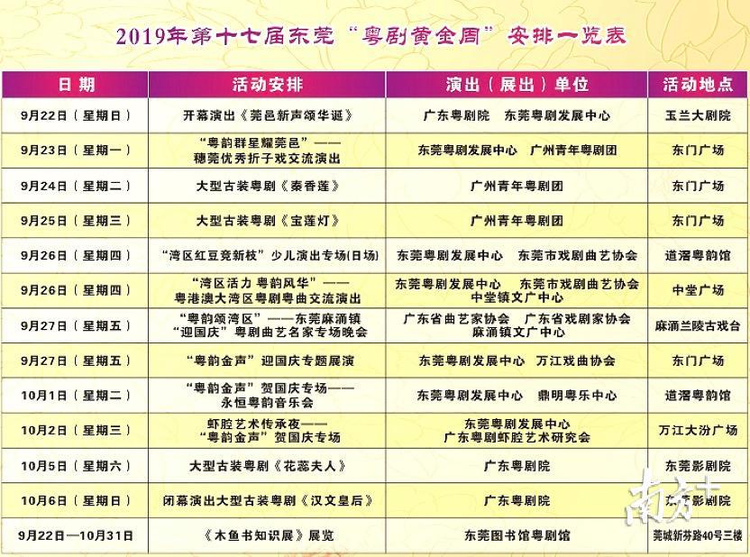 本届“粤剧黄金周”活动地点不只局限在市中心区,还将把各相关镇街的粤剧演出活动统筹整合起来,统一冠名纳入“粤剧黄金周”的主题活动范围。“湾区活力 粤韵风华——粤港澳大湾区粤剧粤曲交流演出”将于9月26日在中堂举行,节目均是来自大湾区多个城市与东莞的精品力作,形式活泼多样,展现不同地域的粤剧文化特色,以达到交流展示、互促共融的效果;9月27日举办“粤韵颂湾区”——东莞麻涌镇“迎国庆”粤剧曲艺名家专场晚会,邀请黄俊英、丁凡、梁玉嵘、倪惠英、何萍、何宝文等名家演唱粤剧曲艺经典曲目;9月26日“湾区红豆竞新枝——少儿演出专场”,将拓宽少儿粤剧粤曲交流渠道,集中展示珠三角地区高质量的少儿粤剧曲艺获奖作品,达到相互学习、相互提高的目的。