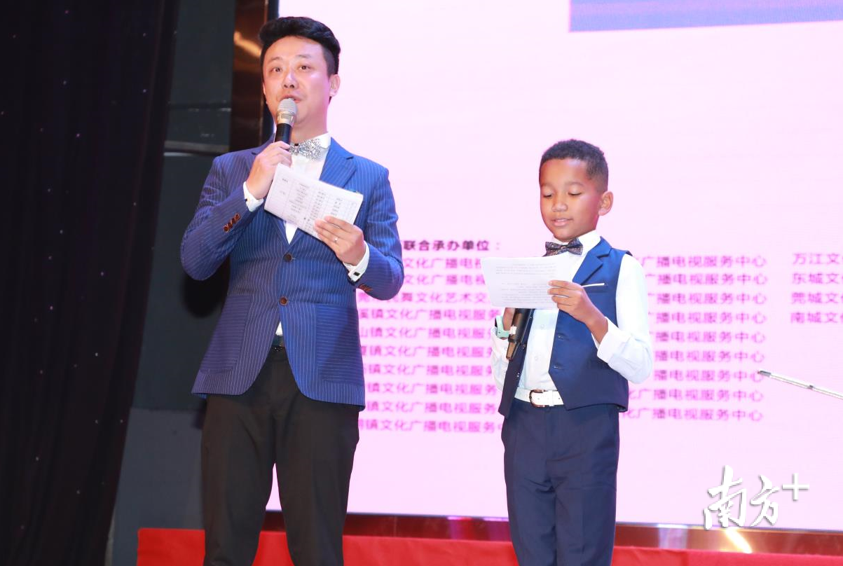 来自塘厦精彩语言中心的中非混血小主持欧文布莱特吸引了大家的目光,只见他黝黑的脸庞下,却说着一口标准的普通话,据介绍,欧文布莱特父亲来自尼日利亚,但欧文自幼在中国出生长大,热爱中国文化,学习语言艺术也有了一段时间,会主持、也会相声,比起上台主持,他更喜欢参与到比赛里头,但一心不能二用,他只能期待下回有更多的比赛机会了。他的出现也让比赛现场增添了一丝国际色彩。