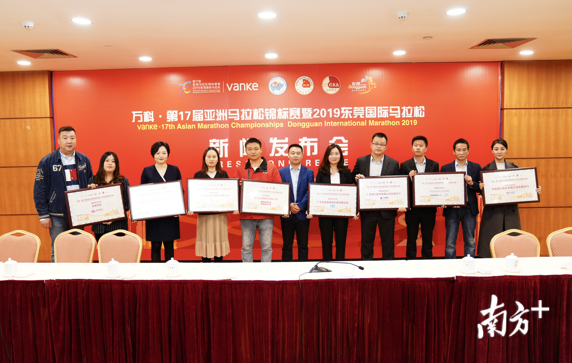 万科是本届马拉松的冠名赞助商,发布会上,黄福泉为东莞市万科房地产有限公司总经理周嵘颁发鸣谢牌匾。