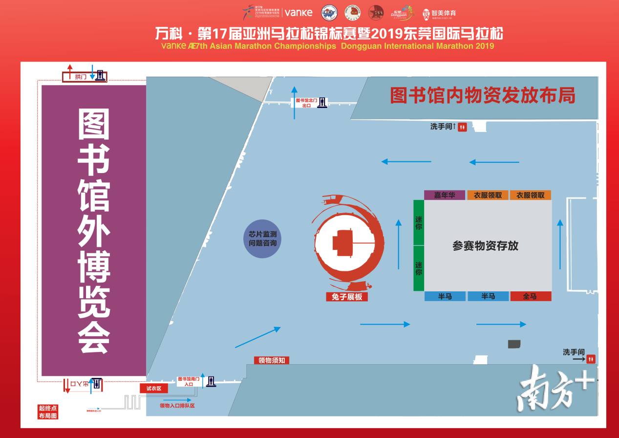 领取参赛物资必须从东莞图书馆南门凭报名确认函进入。