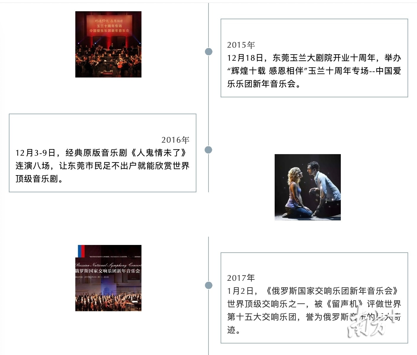 接下来,剧院将陆续发布15周年主题相关活动,让越来越多的观众走进剧院、观看演出、参加活动,感受艺术魅力。一起回顾玉兰大剧院走过的15年,重温这15年东莞人追过的剧。
