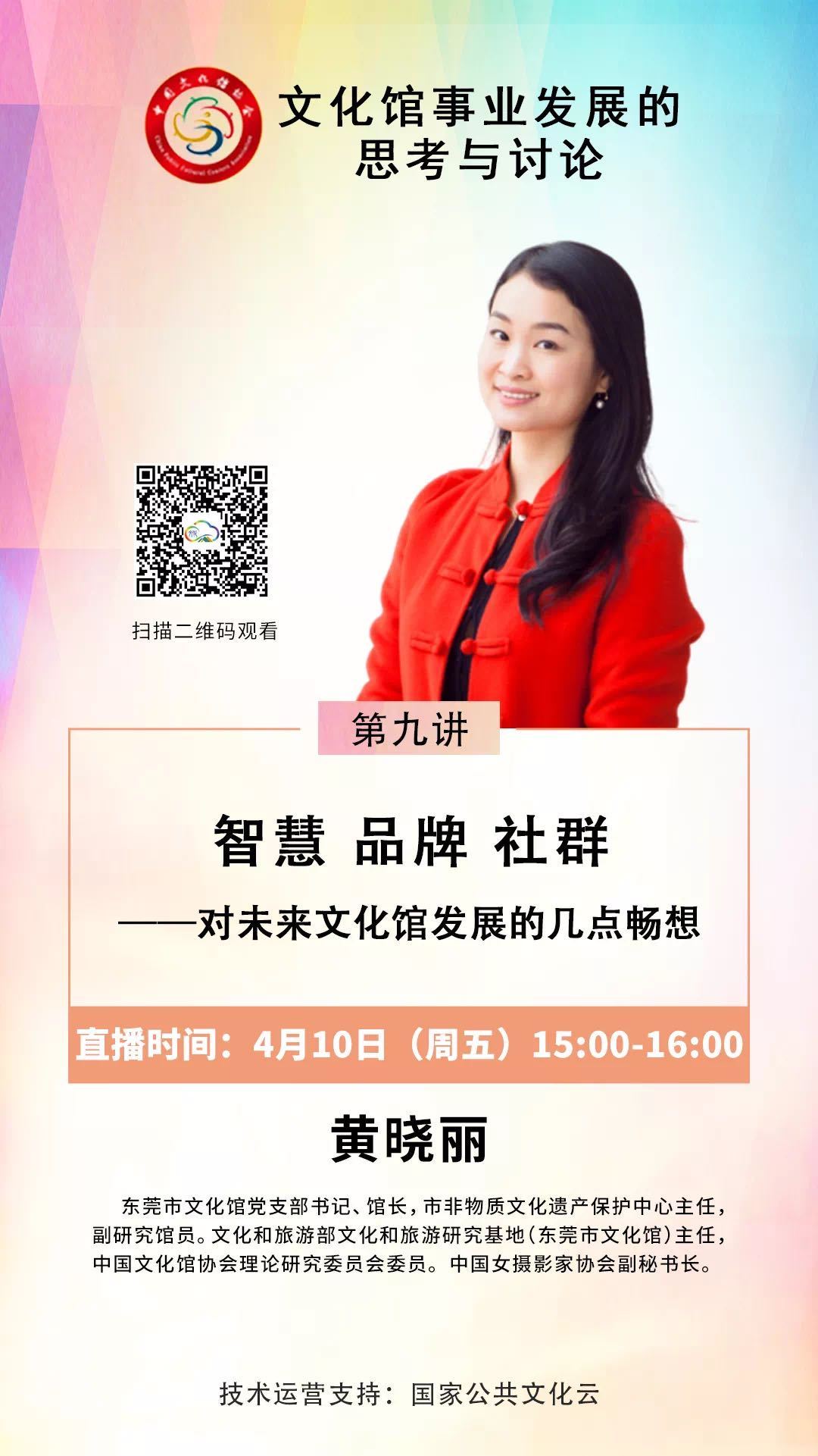 4月10日下午3点,东莞市文化馆党支部书记、馆长黄晓丽主讲的网络课程《智慧、品牌、社群——对未来文化馆发展的几点畅想》上线国家公共文化云。该课程是中国文化馆协会策划组织的“文化馆事业发展的思考与讨论”网络课程的第九讲。