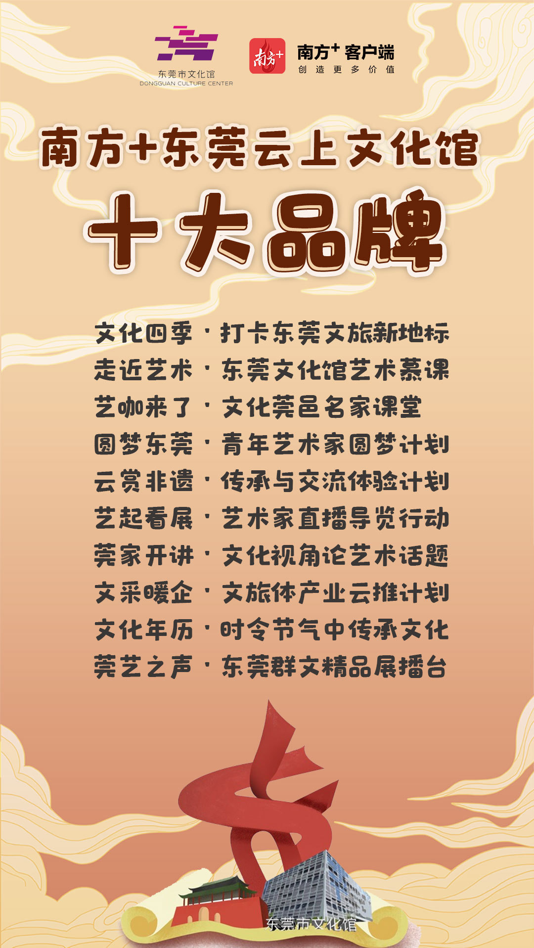 “南方+东莞云上文化馆”上线后,将陆续推出十大品牌项目,精彩的线上活动贯穿全年,助力文化馆开启“云服务”新场景。包括打卡东莞文旅新地标、东莞文化馆艺术慕课、文化莞邑名家课堂、青年艺术家圆梦计划、文旅体产业云推计划、东莞群文精品展播台等。