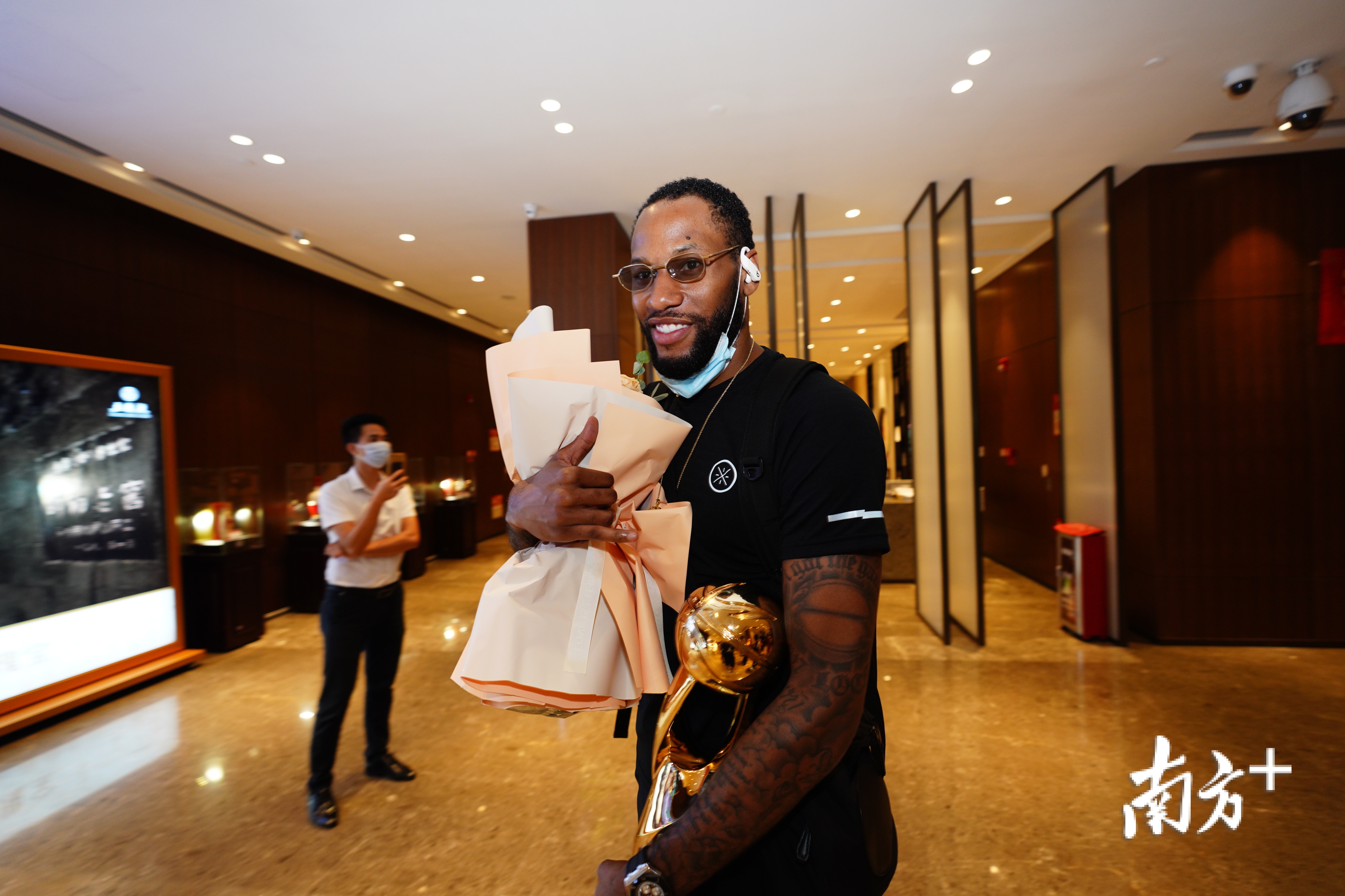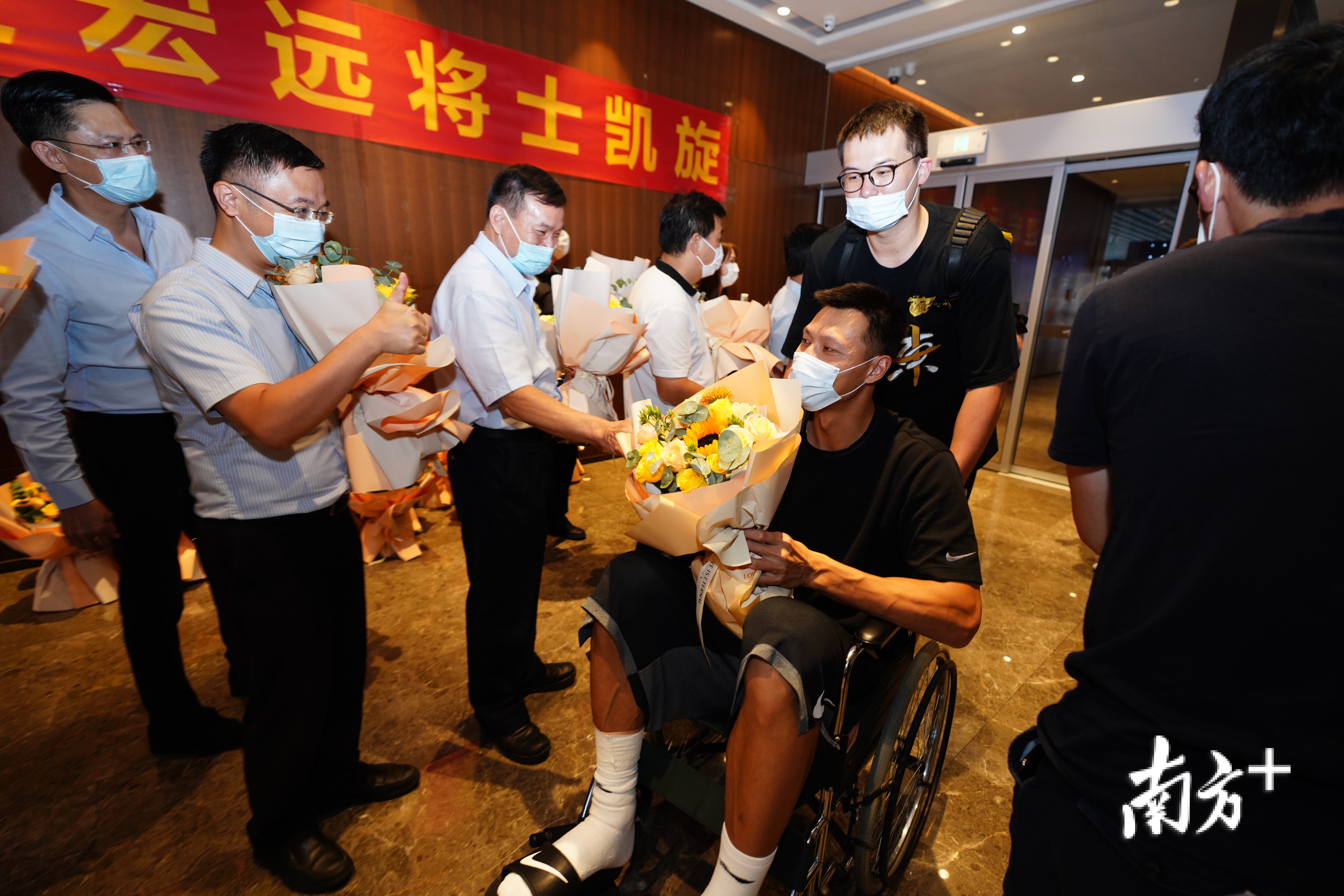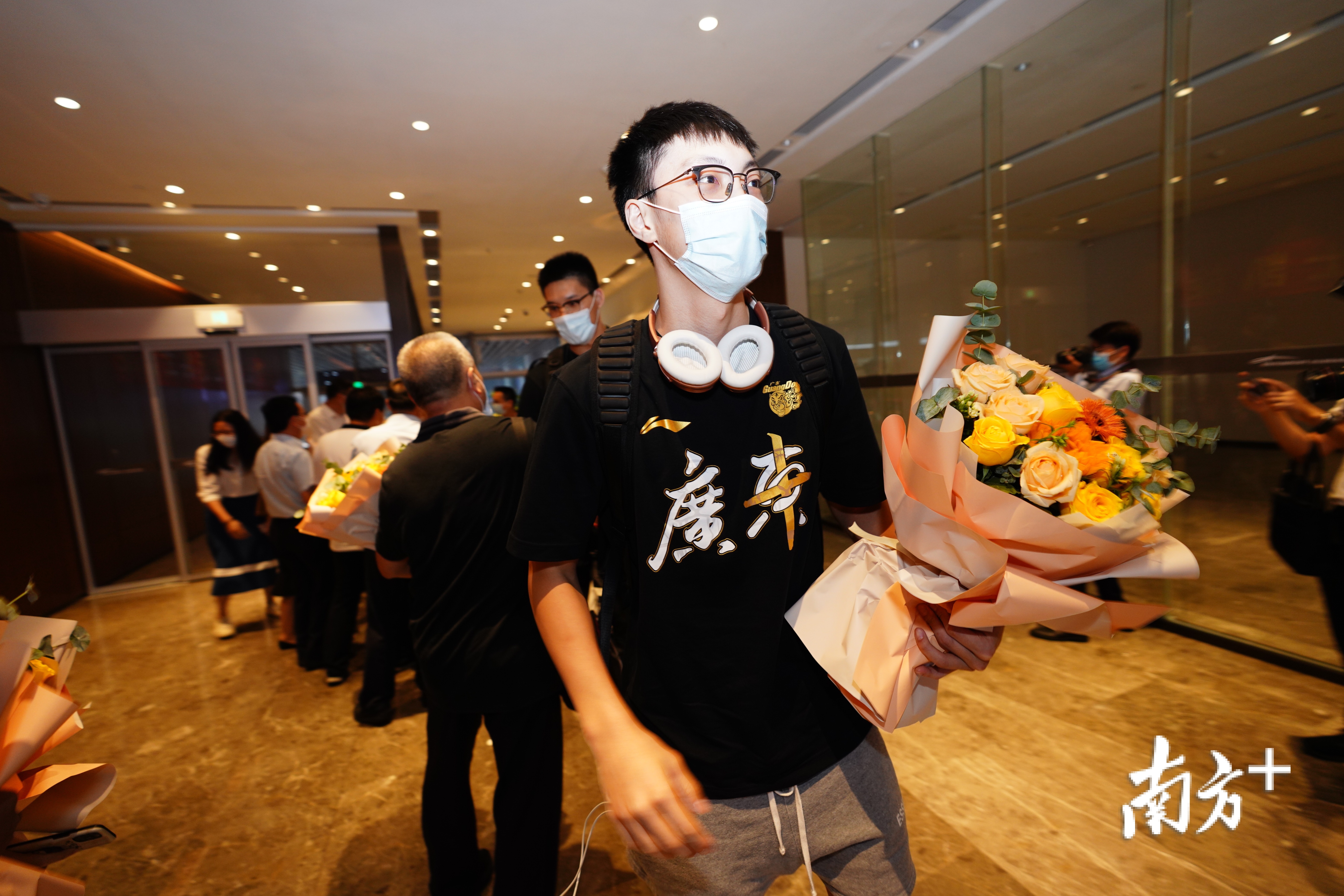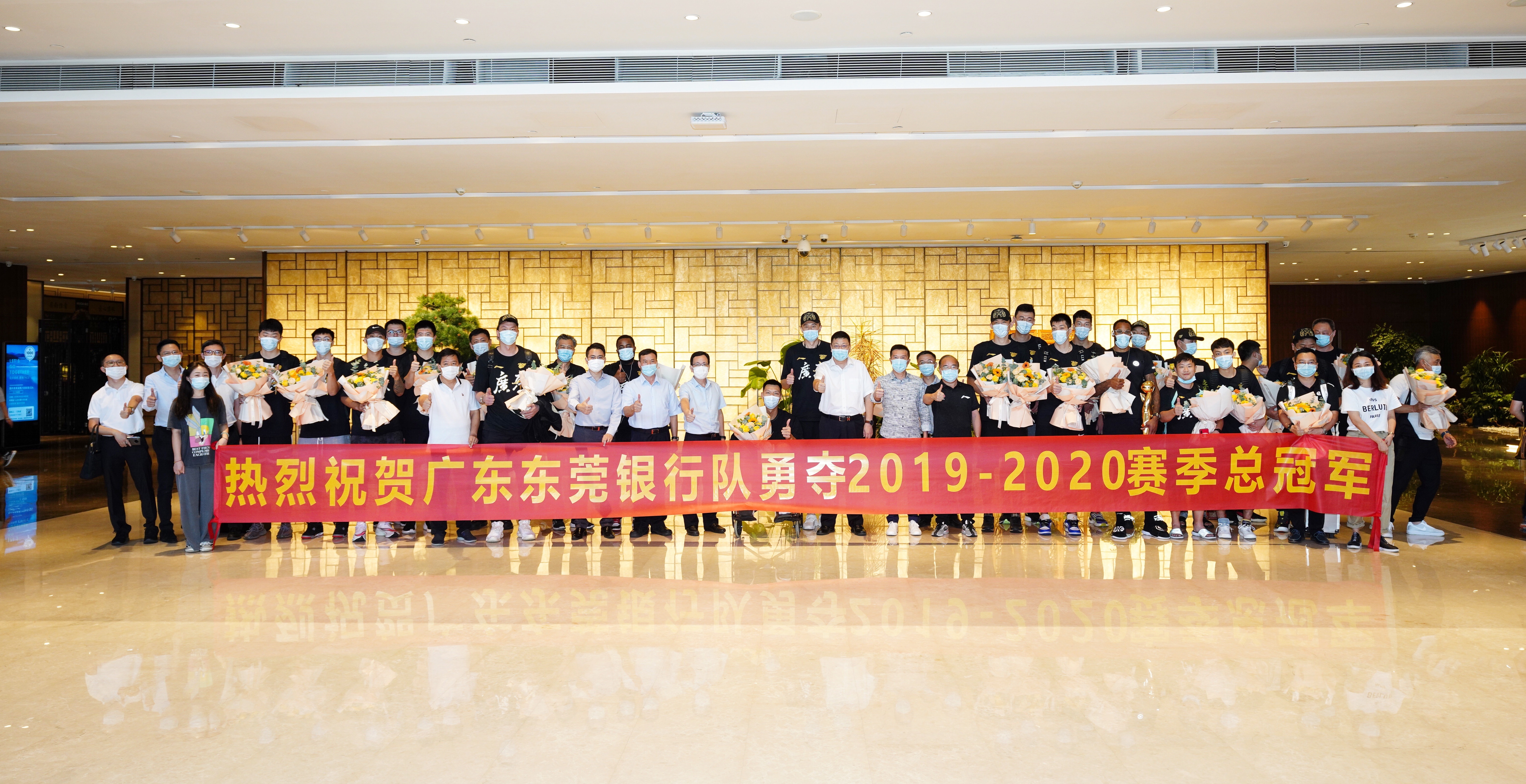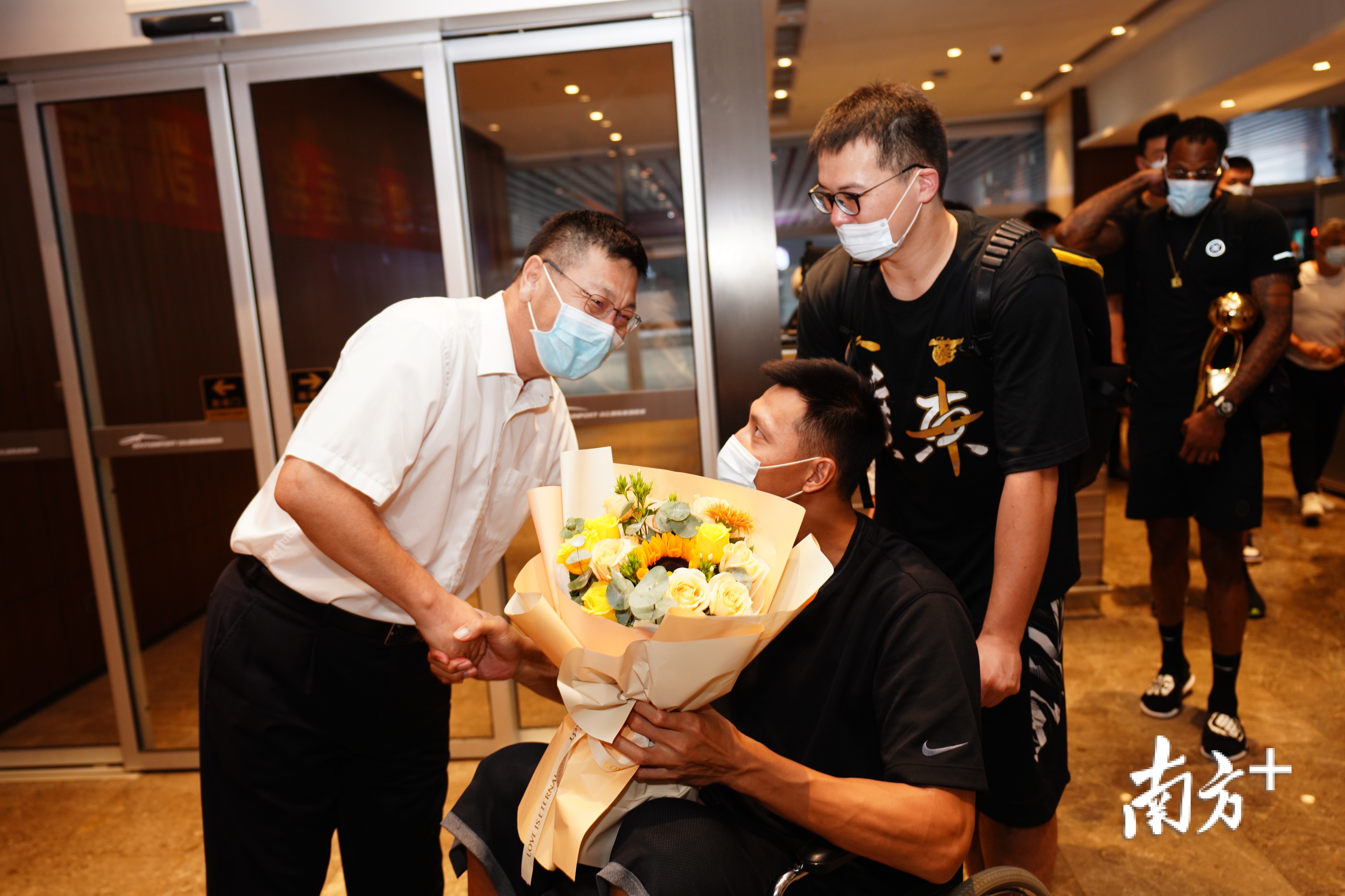 15:20,在机场的国内到达等候区,广东队全体成员现身。东莞市委副书记白涛带领接机团向夺得CBA总冠军的宏远队队员献花。